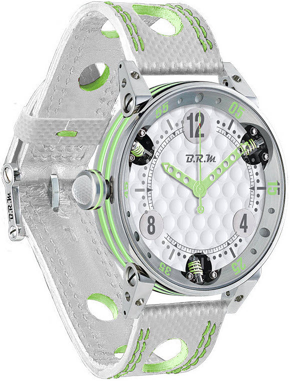 B.R.M Watch Golf Master Ladies Pale Green Hands GF7-38-SA-358. Passionate about high level sports, B.R.M. Watches Bernard Richards set himself the challenge of allowing you to tell the time on your chosen field of play. Thanks to the French made technology of this unique timepiece, you can enjoy your sport without restricting your movements. Its full floating system guarantees you that shocks are completely absorbed.
