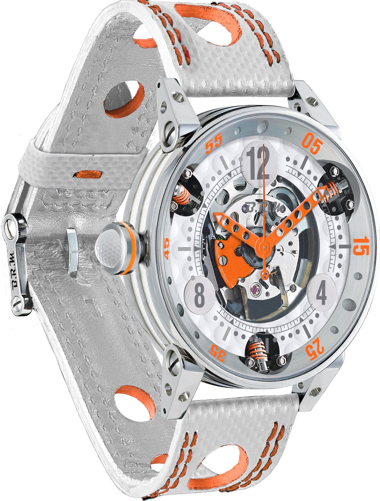 B.R.M Watch Golf Master Mens Orange Hands GF6-44-SA-SQ-AO. Passionate about high level sports, B.R.M. Watches Bernard Richards set himself the challenge of allowing you to tell the time on your chosen field of play. Thanks to the French made technology of this unique timepiece, you can enjoy your sport without restricting your movements. Its full floating system guarantees you that shocks are completely absorbed.