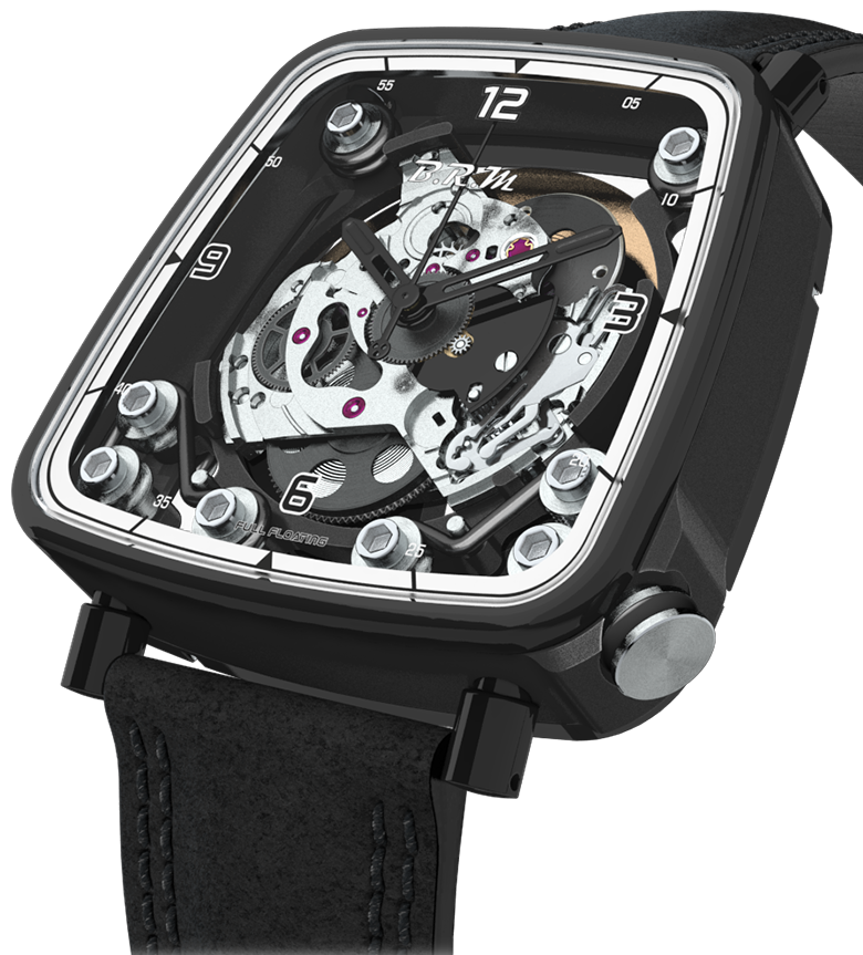 B.R.M. Watches FF39-40 Black Titanium FF39-40-TN-LFN-N. Full Floating, a movement in total, freefall like suspension. The watch manufacture with a sporty DNA has reinterpreted two fundamentals of the mechanical world: silentblocs and belts. In addition to their fine aesthetics, these innovations make the FF39-40 the first automatic watch protected against both vertical and horizontal shocks. The concept is all in the name: FF, for Full Floating. Five ribbed silentblocs, each 1.2 mm thick, and two belts of 1 mm toroid radius, their nitrile formed in molds specially developed at our workshops work together to snuff out all vibrations and protect the watch’s engine-like core: the floating movement. A self-supporting casing ring of hard-anodized Fortal HR enables the five silentblocs to hold the plane vertically. The stainless-steel BTR micro-screws, all machined by material removal, serve to compress a micro-fine carbon strut bar of 0.5 mm, limiting the cage’s lateral displacement within the case. Meanwhile, two belts provide horizontal stability for the automatic movement, itself secured with self-centering, screwed-down braces. The bearing, pressed into a bronze shaft, is screwed into the rotor, to keep the overall structure concentric. The movement’s bored and equilibrated cylinder, with its constant and secure motion control, optimizes the force of the spring, and guarantees a power reserve of approximately 38 hours. The bored, equilibrated, and decorative ratchet offers a superb look of the movement when viewed from directly above. The balance, machined from a bar of Fortal HR and eloxated, is dynamically equilibrated in the 6 positions, for perfect chronometry. All the features above, together with the functional complications within, constitute an ingenious system that seems to render the movement weightless, and make the FF39-40 into a chronometric UFO of highly mechanical aspect.