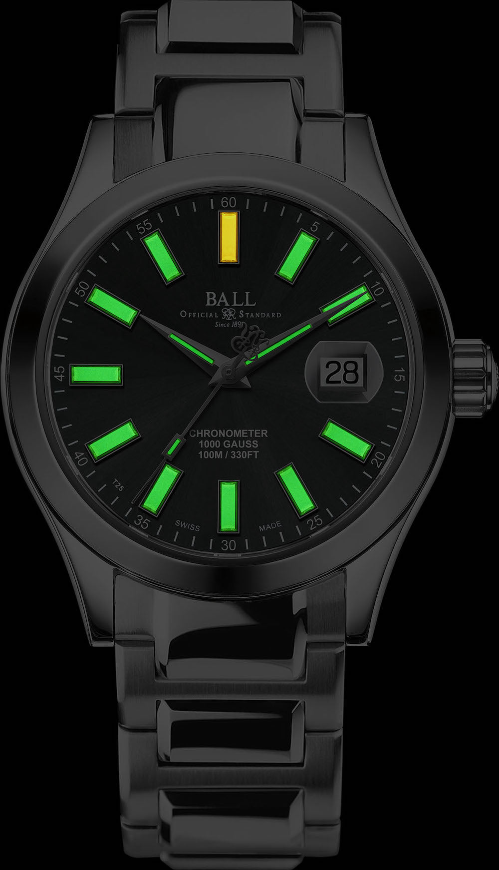 This model is provided with a COSC certified chronometer movement, the automatic caliber BALL RR1103-C. To protect it, a mu-metal anti-magnetic shield has been selected in order to attract and deviate magnetic field lines up to an astonishing intensity of 1,000 Gauss. A screwed-in crown allows a water resistance up to 100 meters and the case is made of 904L stainless steel for higher durability.