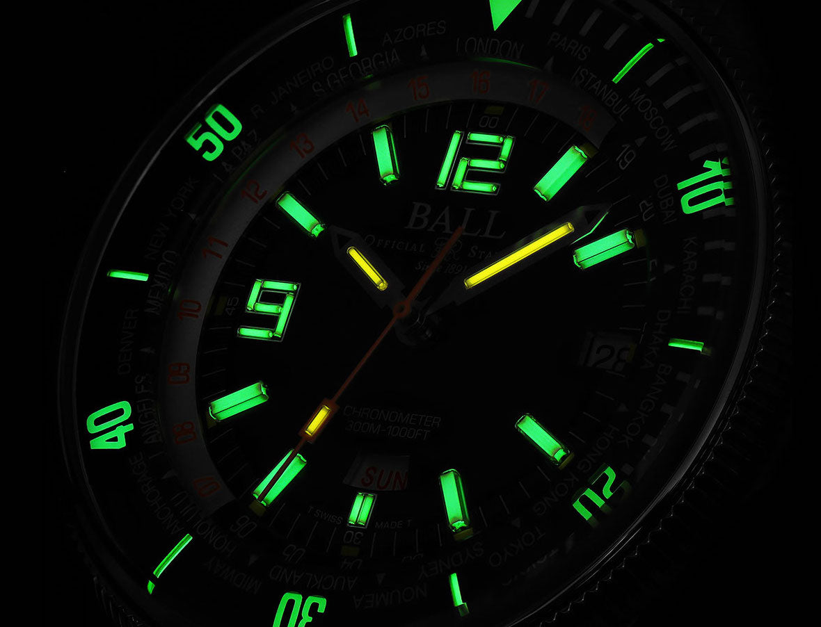 Ball Watch Company Engineer Master II Diver Worldtime Limited Edition DG2232A-PC-BK. A beautiful travelers timepiece. A robust divers tool. The new Engineer Master II Diver Worldtime combines two functionalities into one smart, sporty and stylish companion. Adorned with 24 global cities, it is the only worldtime instrument with day and date functions. The rotating inner bezel shines with micro gas lights and measures dive time up to 60 minutes. Navigate your connected world, on land and at sea.