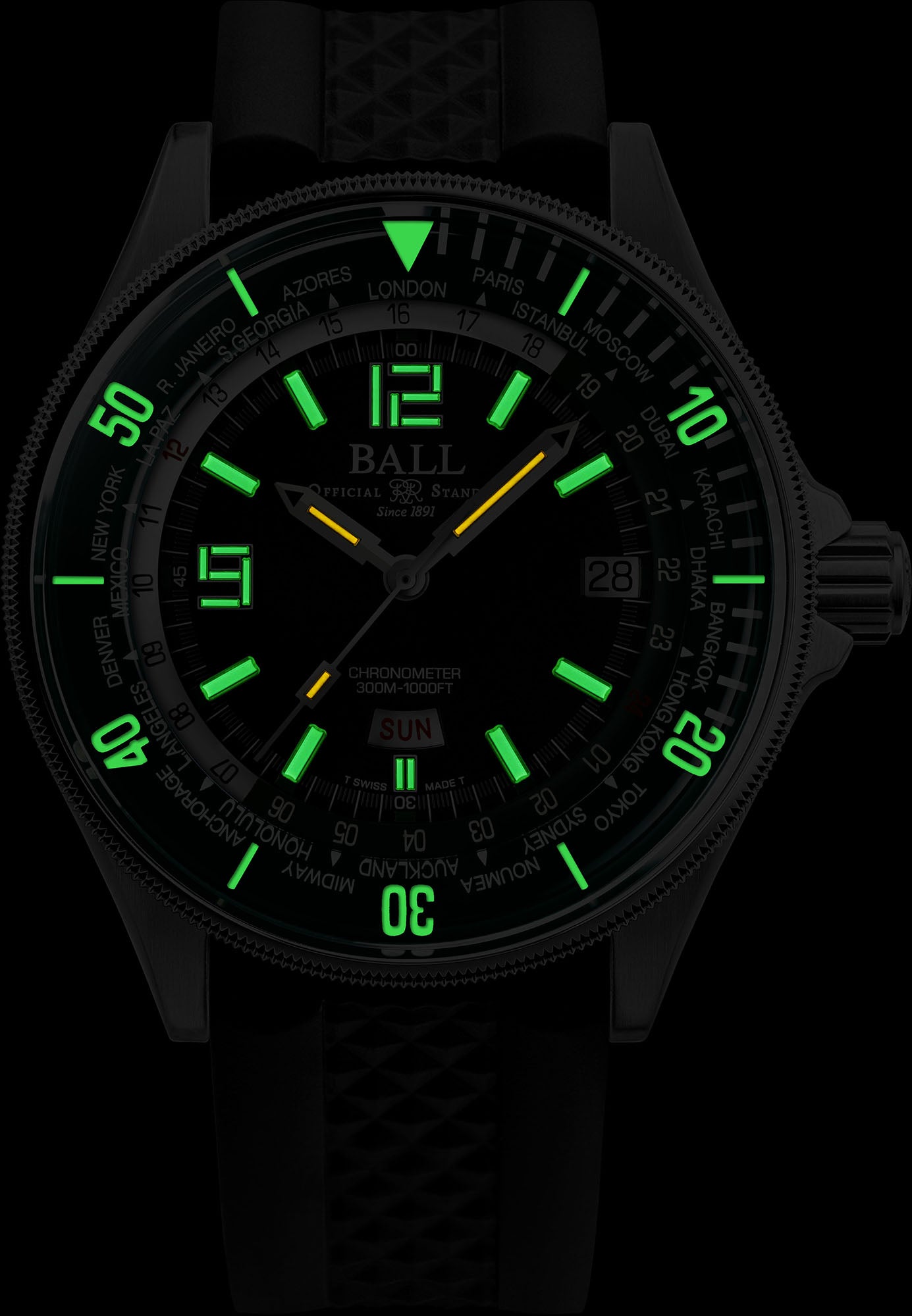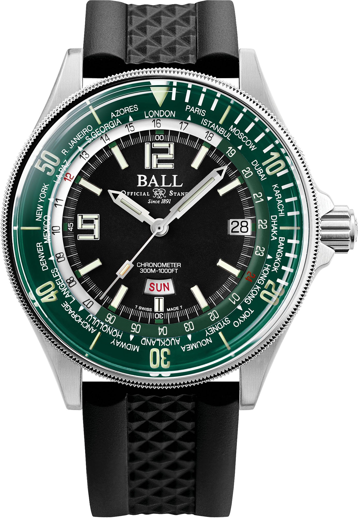 Ball Watch Company Engineer Master II Diver Worldtime Limited Edition DG2232A-PC-GRBK. Diver Worldtime. The name alone sparks curiosity. Then the functionality sparks worldwide adventure above and below the surface. Redesigned and crafted from the finest materials, the chronometer is equally a beautiful traveler’s timepiece and a robust diver’s tool. Its new 42mm case streamlines toughness, while bolder micro gas tubes enhance readability on a refreshed dial. And, now, the inner diving and city ring is controlled by an external bezel for the accelerated pursuit of adventure. An icon without compromise and competition further sets itself apart.