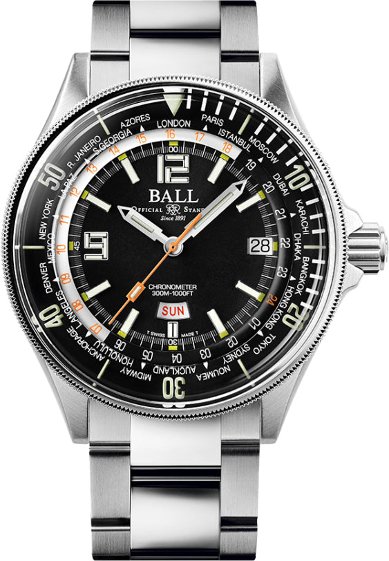 Ball Watch Company Engineer Master II Diver Worldtime Limited Edition DG2232A-SC-BK. A beautiful travelers timepiece. A robust divers tool. The new Engineer Master II Diver Worldtime combines two functionalities into one smart, sporty and stylish companion. Adorned with 24 global cities, it is the only worldtime instrument with day and date functions. The rotating inner bezel shines with micro gas lights and measures dive time up to 60 minutes. Navigate your connected world, on land and at sea.