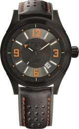 The automatic calibre BALL RR1103 movement sits within a comfortably sized 43mm stainless steel and black DLC case that has passed the 5,000GS crash test and is water resistant to 100 metres. The sapphire crystal glass with antireflective treatment overlooks a striking grey and orange detailed dial fixed with 15 luminous micro tubes that will glow in the dark for up to 25 years without requiring any recharge. The dial is also completed by a date feature at four o clock and a sweeping seconds hand. To fasten this Ball Fireman Racer DLC watch to your wrist, the timepiece comes on a black calf leather strap and stainless steel black DLC buckle.