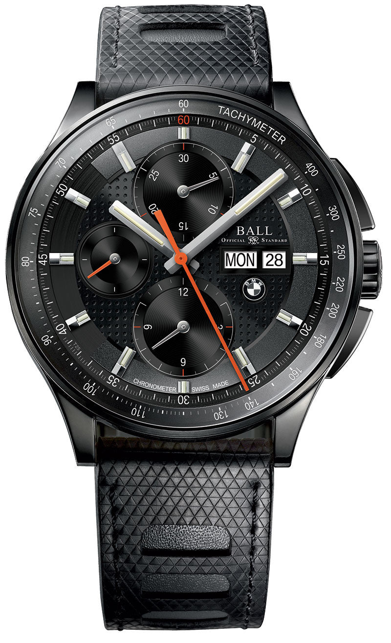 Ball Watch Company For BMW Chronograph DLC CM3010C-P1CJ-BK. The aesthetic of the new BALL for BMW watch collection is highly influenced by the lines of BMW cars and includes details that evoke their engines and bodies: the aerodynamic lines of the case are underscored by the slimness of the rim of the case middle, which shears off to form elongated and well defined horns. Here, style is in its purest form, a clever blend of recognition, identification, ergonomics, comfort and an ideal sense of proportion, which is not without evoking the dynamic profile of BMW cars. In the words of Magali Metrailler, the renowned designer heading up this exclusive project, A line that is lightness personified. This new BALL for BMW watch collection is also exceptional in terms of its restrained sportiness incorporating sophisticated technology. BALL Watch has equipped its new BALL for BMW watch collection with the revolutionary patented anti-shock concept: Amortiser. This marvel of micro mechanical engineering absorbs lateral impacts and so protects the mechanical movement whenever it is on the wrist. We were inspired by the architecture of bridges, such as that in San Francisco, and the work accomplished by engineers to limit the shock waves caused by the passage of vehicles, explains Philippe Antille, Chief Technology Officer (CTO) at BALL Watch. BMW is synonymous with high technology, so we wanted to pay homage to that by utilizing the full scope of our watchmaking expertise, he added.