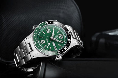 The Roadmaster Marine GMT features the BALL’s GMT quick-set mechanism allowing travelers to easily adjust time zones. Simply by turning and pressing either one of the patented quick-set buttons, the GMT hand can be easily set instead of using the main crown. The button at 8 o’clock moves the GMT hand backward, while the 10 o’clock button moves it forward. Combined with a bi-directional 24-hour bezel and main hands, the Marine GMT allows for three time zones to be tracked simultaneously.