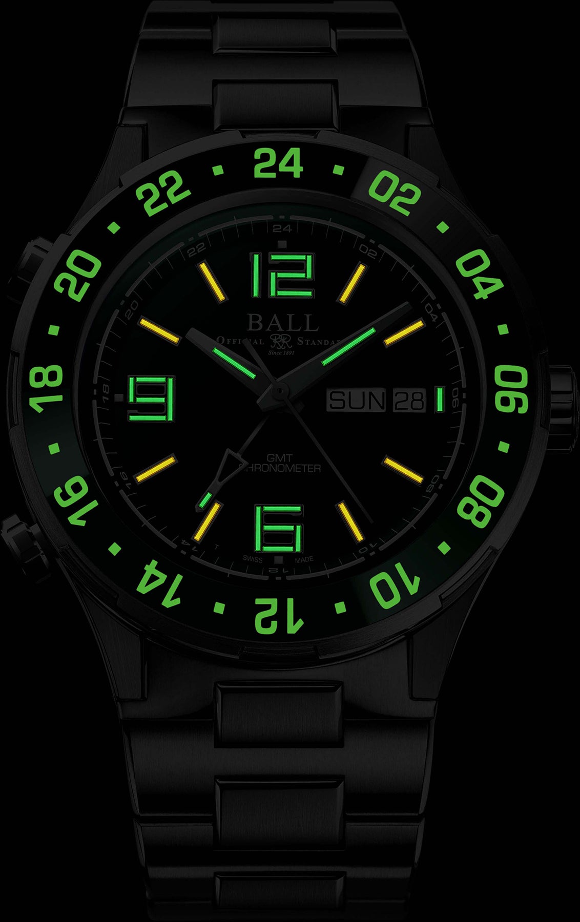 In the darkest conditions, time can be read thanks to the self-powered H₃ gas tubes carefully mounted onto the dial at each hour marker as well as the main hour hand, minute hand and GMT hand. This cutting-edge Swiss technology consists in encapsulating H₃ gas in glass micro tubes. These micro tubes don’t require recharge from any external light or energy source.
