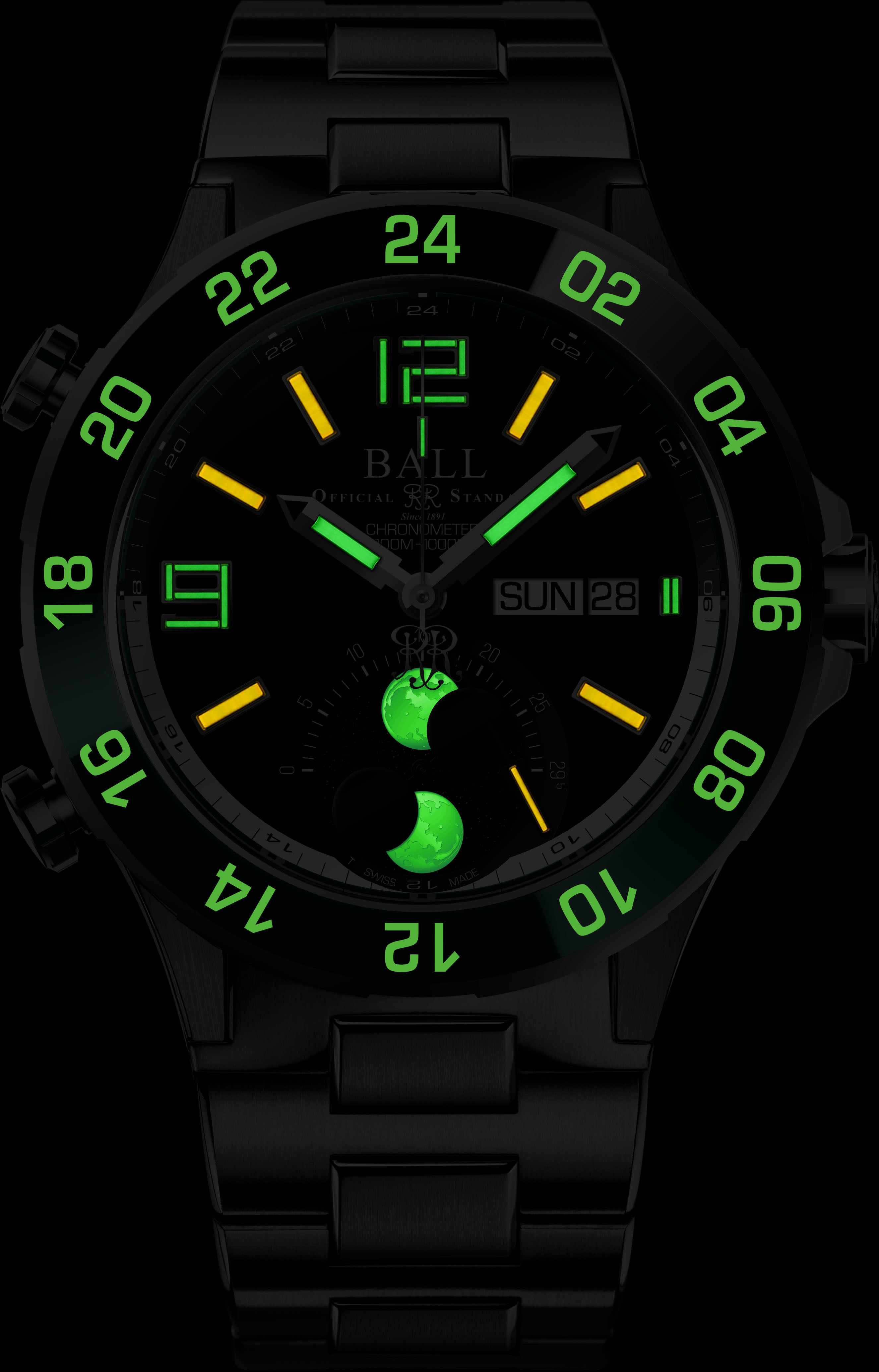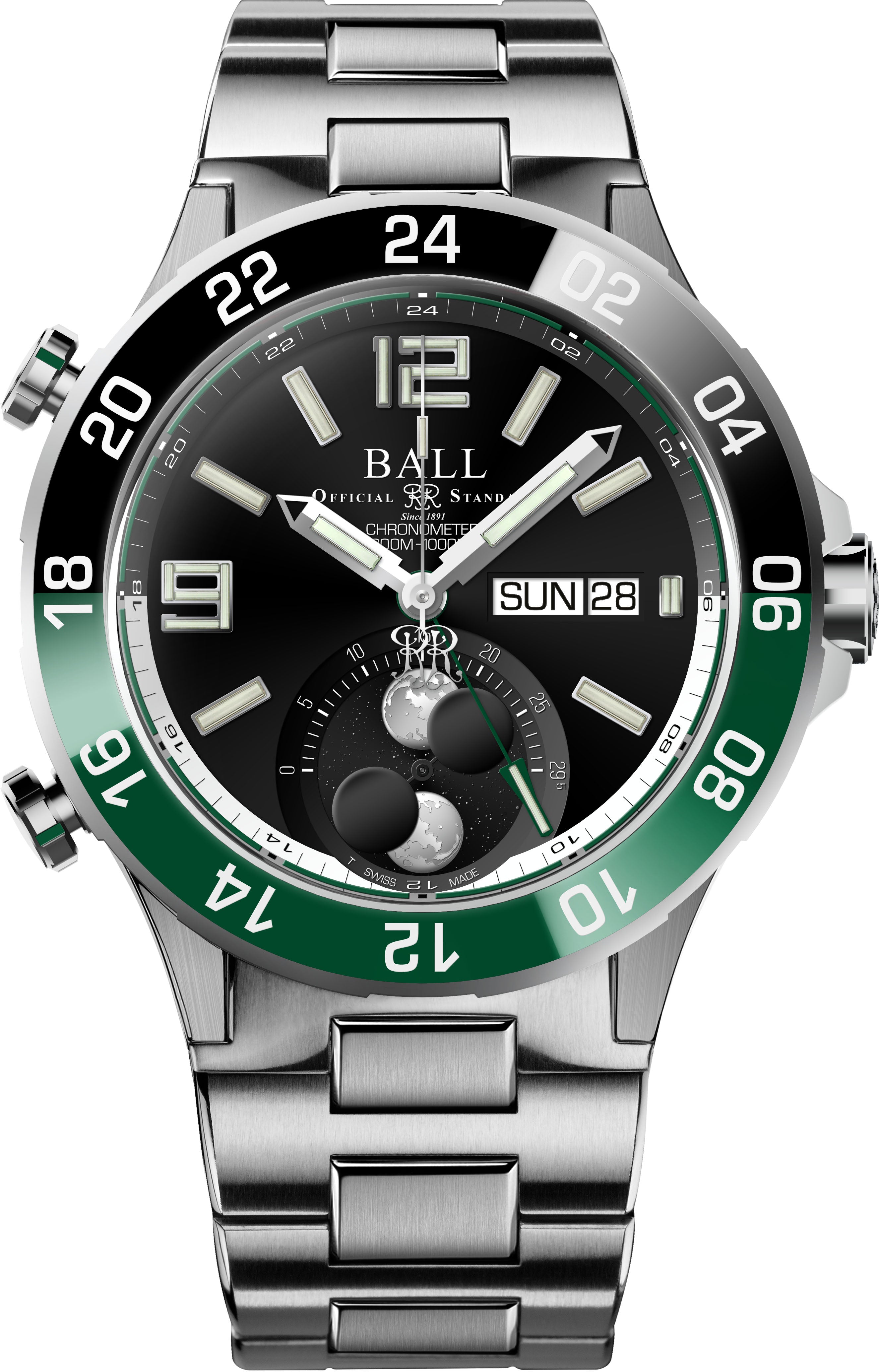 Ball Watch Company Roadmaster Marine GMT Moon Phase Limited Edition DG3220A-S2C-BK. Named for those who are in charge of guiding railroad infrastructure, the Roadmaster series is a diverse collection of timepieces that combines unique materials, robust resistance technology and distinct designs. No matter the design or utility, every Roadmaster is a tool watch united by our signature micro gas tube luminosity.