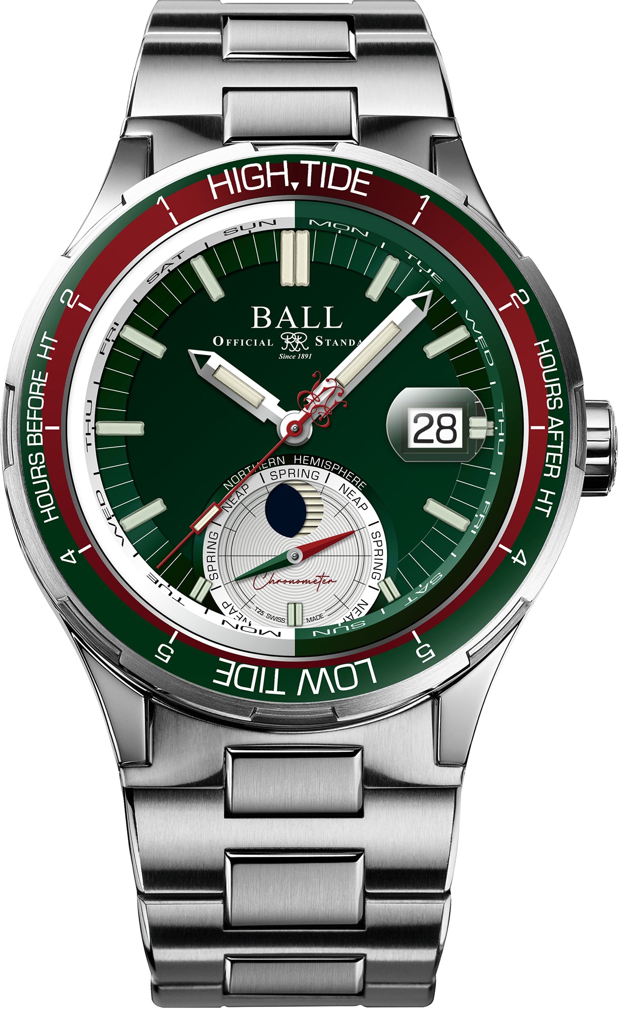 Ball Watch Company Roadmaster Ocean Explorer Limited Edition DM3120C-S1CJ-GR. Those born to voyage beyond the horizon, ready to brave any storm. The Roadmaster Ocean Explorer equips you with a rotating external bezel that indicates high and low tides for a two week period, while our in-house movement module reveals spring and neap tides alongside an illuminated moon phase indicator. Designed to move against the current, it delivers toughness presented in a 41mm stainless steel case with robust water resistance. Its unique character and performance combine to create the ultimate watch for the open seas.
