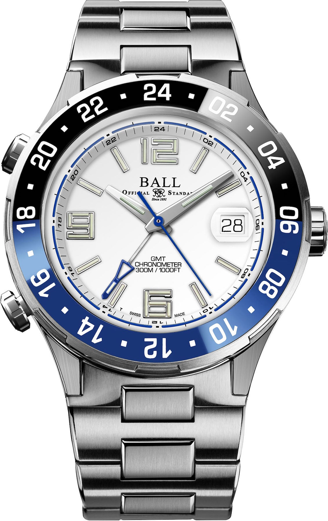 Ball Watch Company Roadmaster Pilot GMT Limited Edition DG3038A-S4C-WH. As a testimonial to our commitment to excellence, the Roadmaster Pilot GMT is equipped with two remarkable timekeeping functions that soar to new levels of convenience. When traveling, simply push the quick-set buttons to jump the local 12 hour hand to its desired position without stopping the second hand. Then easily turn the crown to jump the date correctly into position, eliminating the need to circle the dial with the hour hand. Complete with a virtually scratchproof ceramic bezel, amazingly bright micro gas lights and chronometer grade precision, the Pilot GMT is an ingenious everyday watch for the modern explorer.