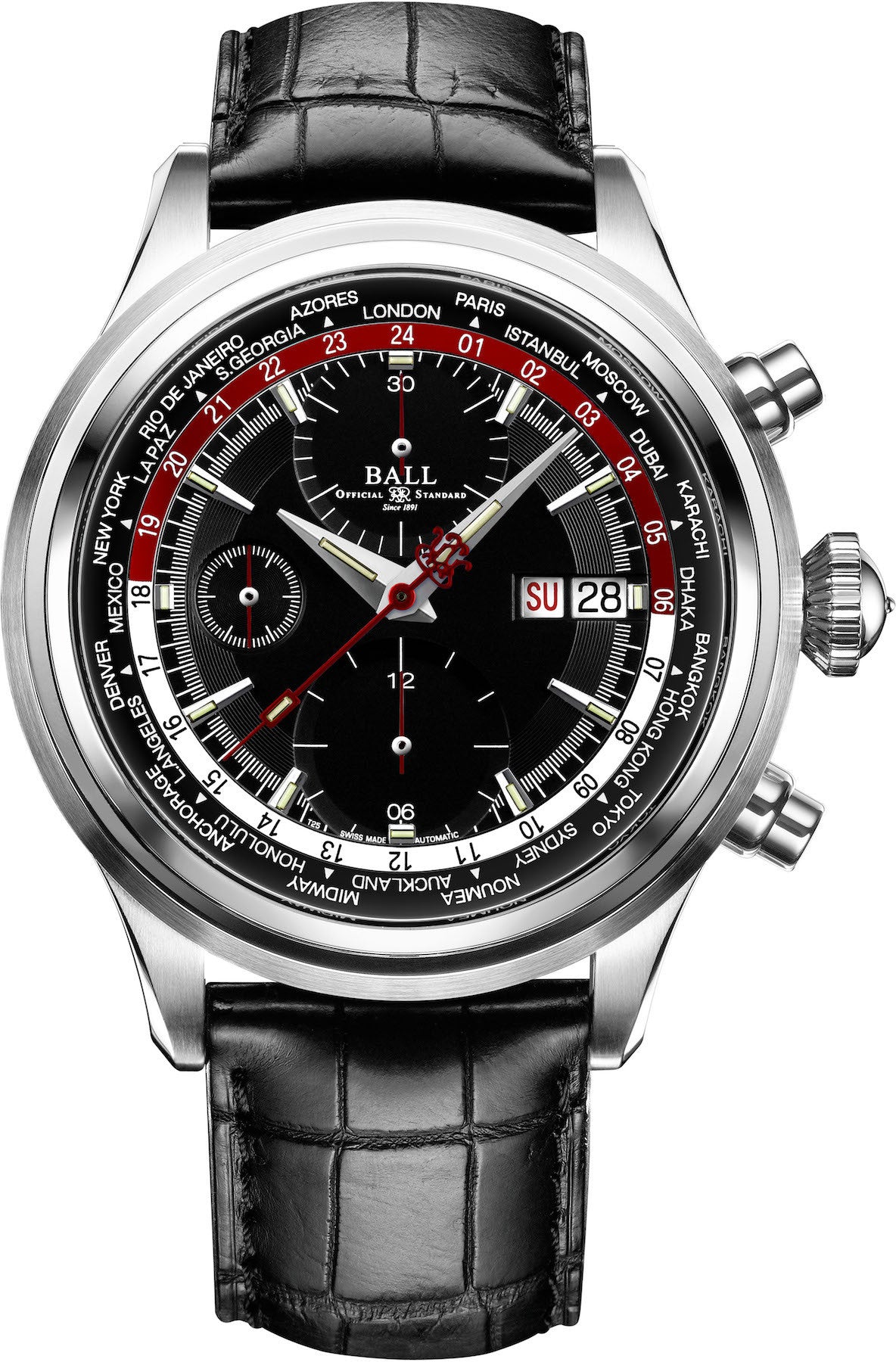 Ball Watch Company Trainmaster Worldtime Chronograph CM2052D-LL1FJ-BKRD. To provide watches that can operate at the same time in the four corners of the globe for inveterate travellers and businessmen off to conquer the world. Today, the brand reveals the second generation of model Trainmaster Worldtime Chronograph, with an enhanced technology and a gently redesigned look, both developed in house. In this way, Ball watches is offering a new tool that is able to display at any given moment the common denominator of all human beings, namely the passage of time and the value that each man and woman places on it. In its absolute respect for the values of precision, reliability and tradition of the Trainmaster series, the Worldtime Chronograph thus provides a worthy addition to the BALL watches combining a day and date function with the time display in the 24 hour zones. Grafted onto a standard automatic chronograph movement, a special module drives a disk engraved with the names of the planets main metropolises rotating automatically in the reverse direction to the hands, so that it simultaneously indicates the time in 24 different geographic zones.