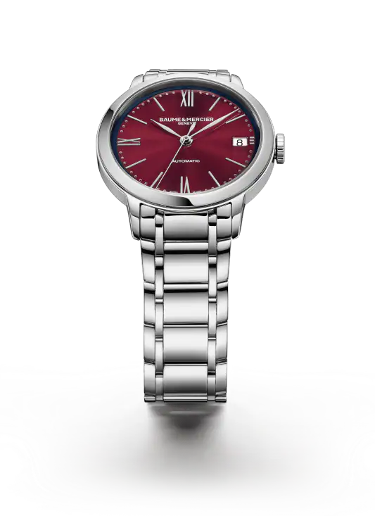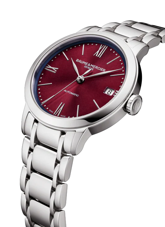 With an intense burgundy color dial and Roman numerals, this automatic watch for women offers a clean, modern aesthetic balanced with classic detailing. The timepiece is mounted on an interchangeable stainless steel bracelet or a canvas strap that will suit all occasions.