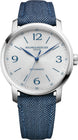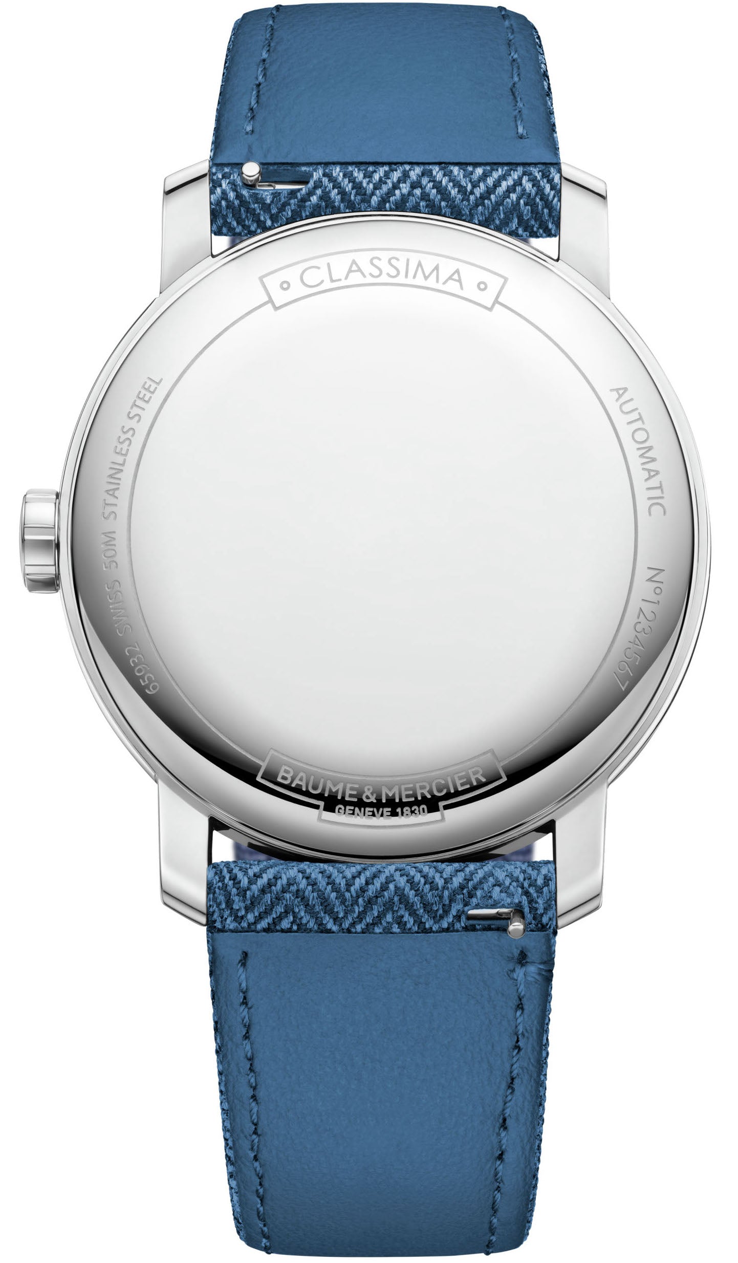 Baume et Mercier Watch Classima Mens M0A10707. Driven by a self-winding movement with a 42-hour power reserve, the M0A10707 model indicates the hours, minutes and seconds. Nestled within a 42 mm case, the silver sun satin dial with a chevron pattern is enhanced by blue Arabic numerals, indexes and leaf hands. The bracelets are crafted in a saddle-stitched blue fabric (wool) with a chevron pattern and black alligator skin.