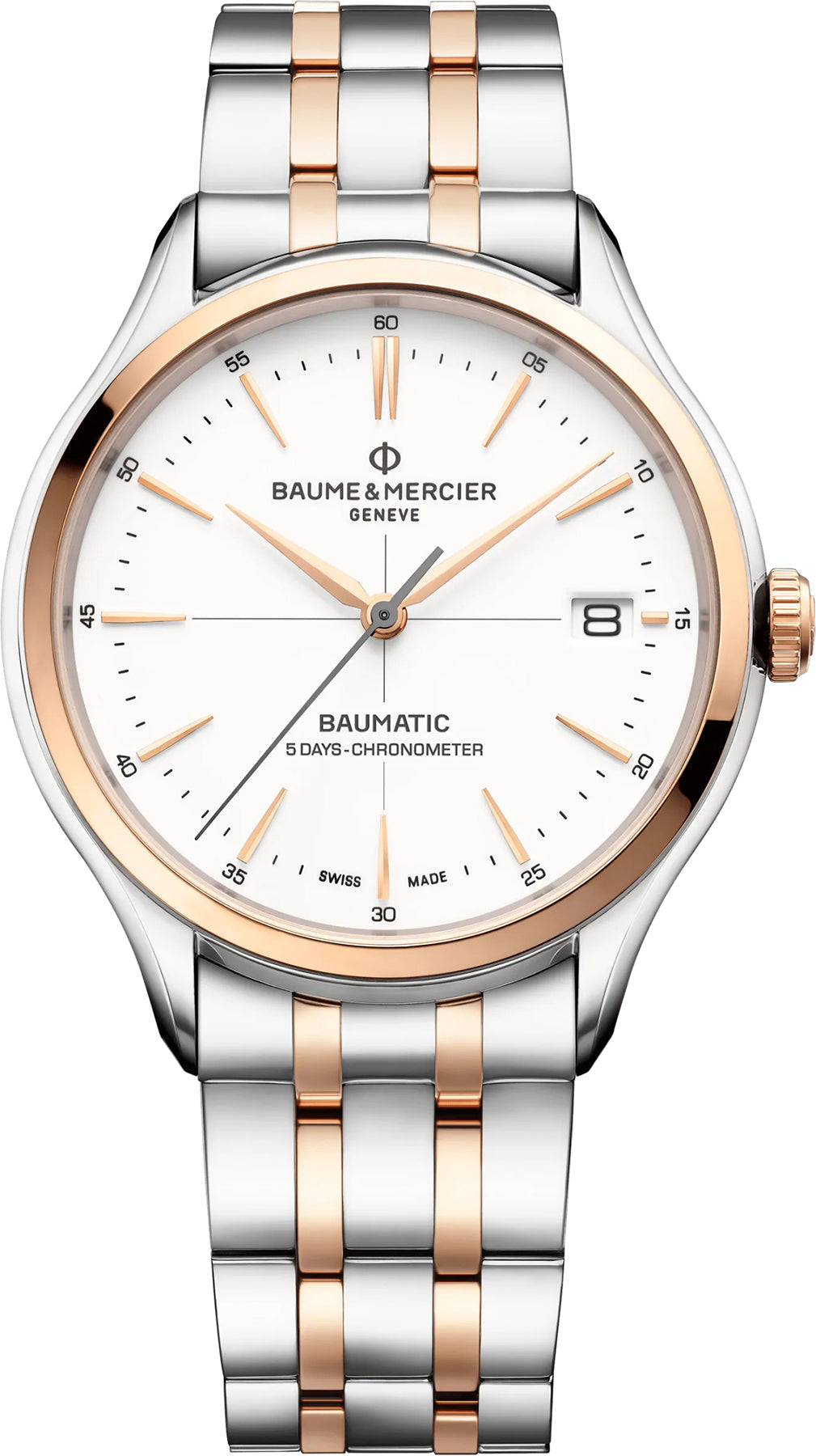 This Baume et Mercier Clifton Baumatic watch perfectly characterises the watchmaking expertise and contemporary style that the brand has long been recognised for since its founding in 1830. The elegant curves of the polished and satin finished stainless steel case and the luxurious finish of the two toned rose gold and stainless steel bracelet mould effortlessly to the wrist for a comfortable and sophisticated finish while the powerful in-house automatic winding movement promises only the best in precision and performance.