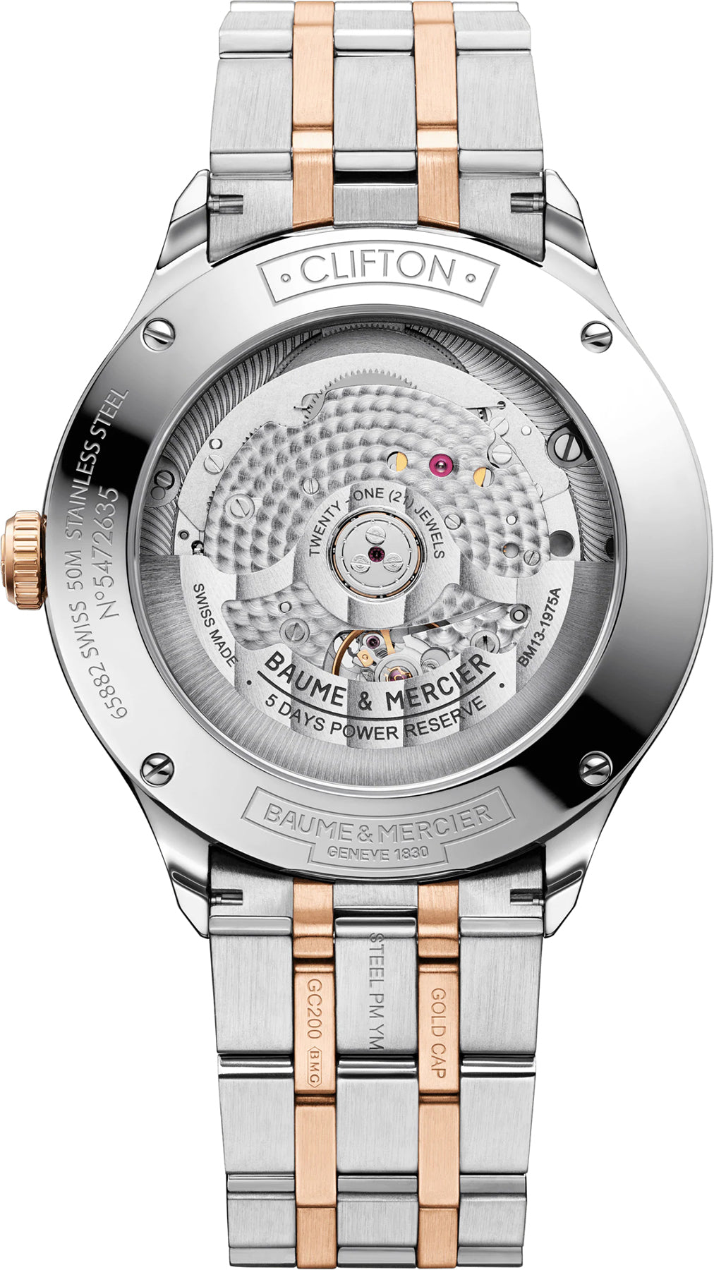 It’s clear to see that every Baume et Mercier watch has its own distinctive personality and this Clifton Baumatic model is no exception. Its stunning warm white porcelain-like dial is decorated with sleek gilt indexes and hands and an elegant date window at 3 o clock. Each of these functions are powered by the Swiss made Baumatic BM13-1975A automatic winding calibre, an in-house COSC certified movement with 21 jewels and a remarkable power reserve of 120 hours. Synonymous with elegance and beauty, the stainless steel case measures to 40mm in size and is fitted with a fixed rose gold bezel, scratch resistant sapphire crystal glass treated with anti-reflective treatment and an exhibition case back where you can witness the refined circular-grained bridges, sand-blasted, snailed base plate and the skeletonised oscillating rotor adorned with the famous Cotes de Geneve decoration.