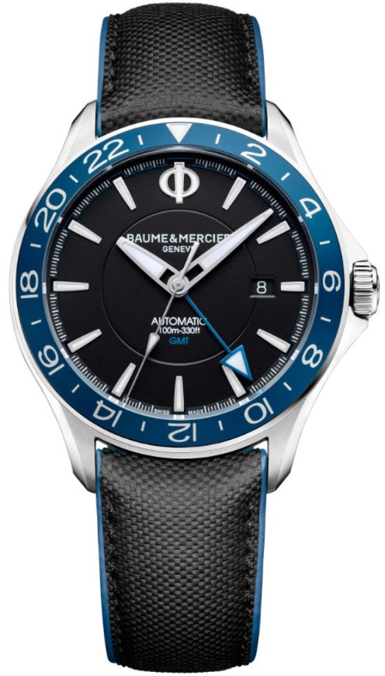 This Baume et Mercier Clifton GMT watch instantly impresses with its striking blue aluminium bezel, smooth black dial and sleek steel hands and indices. A simple seconds hand, enlarged blue coloured GMT hand and date window a 3 o clock also decorate the dial alongside the brand’s famous Phi character logo at 12 o clock which represents the brand’s quest for perfection. The 42mm stainless steel case and sapphire crystal glass with anti-reflective treatment keeps the incredible Swiss made automatic calibre hidden. The case back of the Baume et Mercier Clifton watch is also kept closed and decorated with a stunning ‘Clifton’ engraving, the brand’s logo and the Baume Mercier watch serial number.