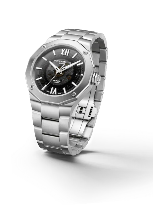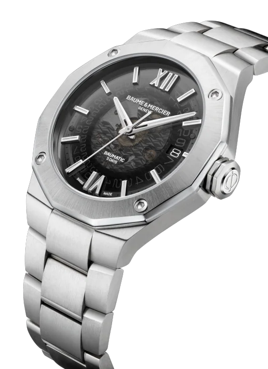 Driven by the prestigious Baumatic manufacture calibre, the Riviera 10702 is the all-road Swiss watch by excellence. Its transparent smokey grey sapphire dial, its interchangeable metal bracelet and open caseback complete the sporty look of this Swiss made timepiece.