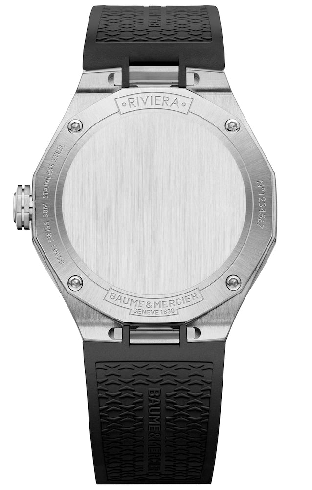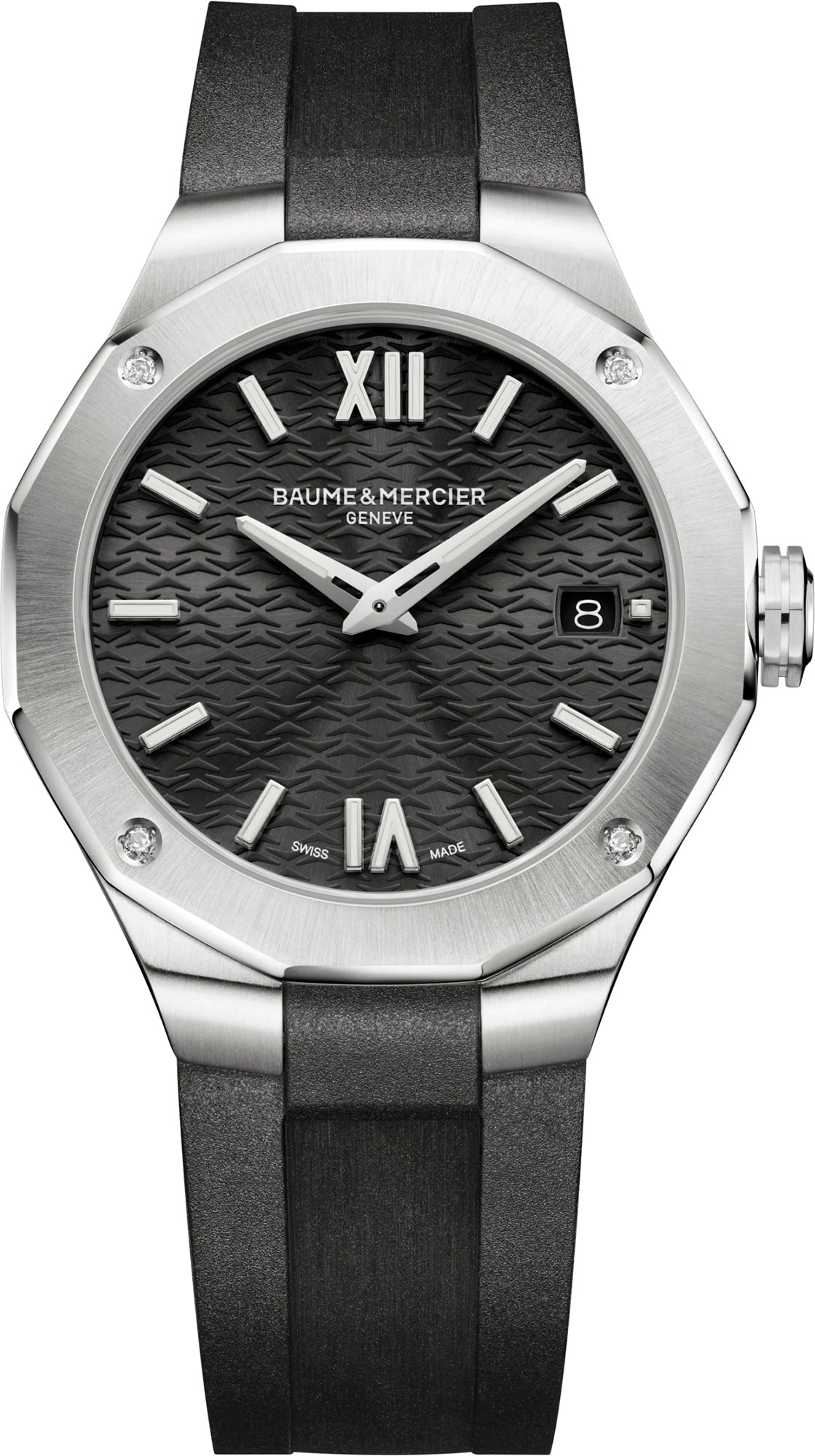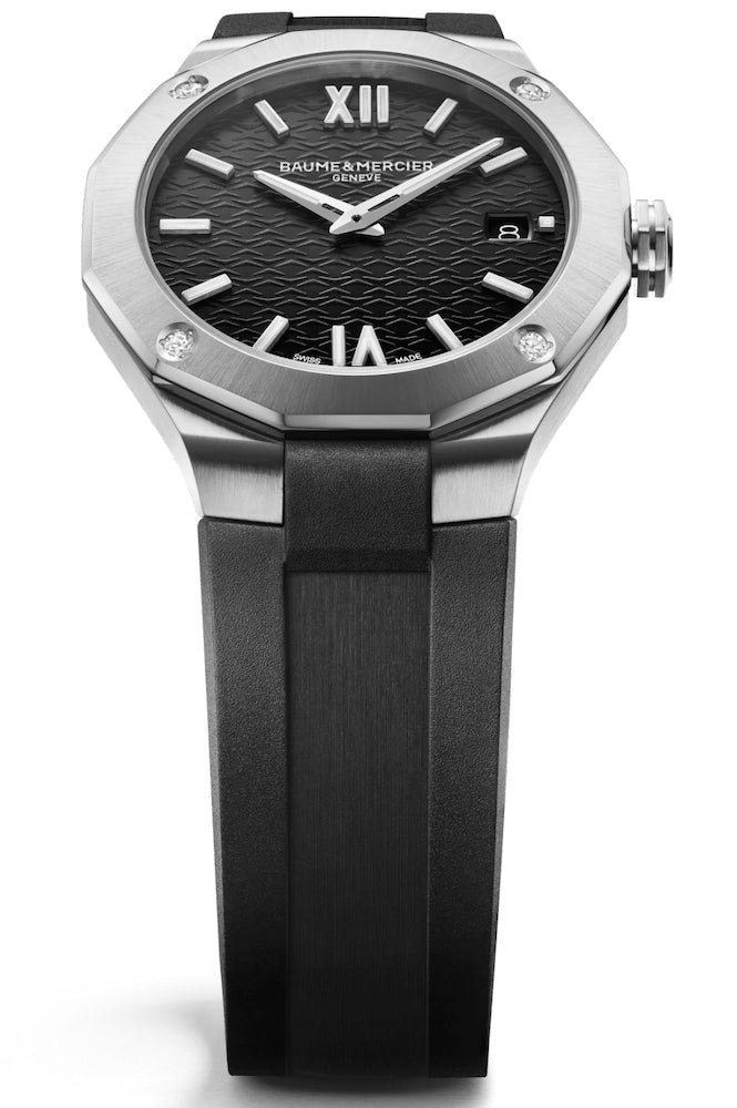 The lady’s Baume & Mercier Riviera watch features a central hour and minute hand treated with a fine line of Super LumiNova material, as well as a central second hand and a date window at 3 o’clock to keep on track of each passing day of the month. The hour track features the traditional Roman numerals positioned at 12 and 6 o’clock, accompanied by a remaining scale represented by stick markers. The watch secures closely to the wrist with a comfortable black rubber strap and steel folding clasp, creating a distinct steel sports look. This stylized look is enhanced all the more by the watch’s dodecagonal shaped bezel embedding four scintillating diamonds that replace the more familiar hexagonal screws.