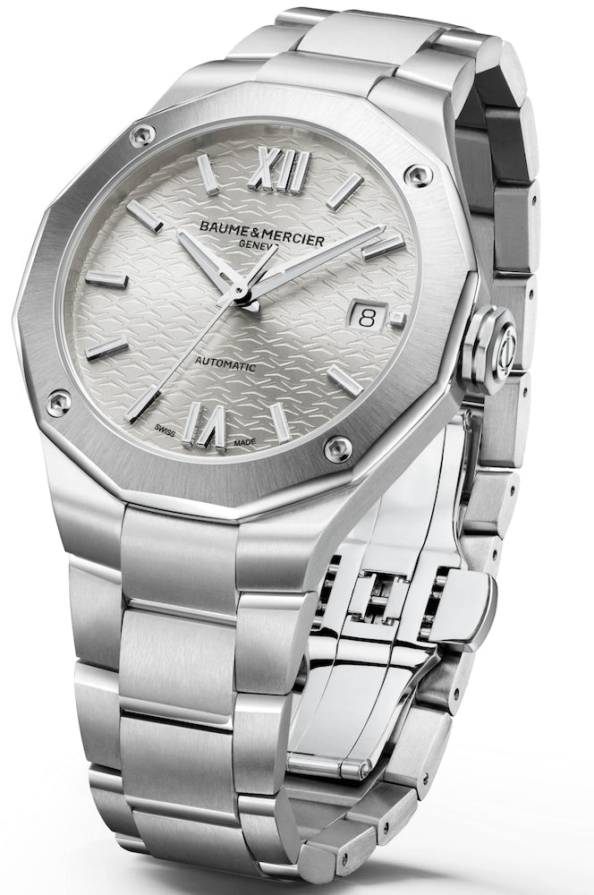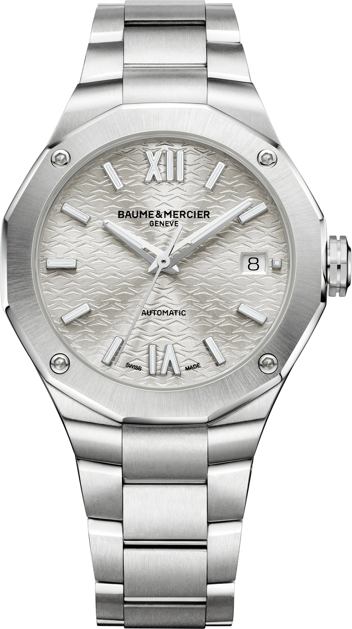 Powered by a reliable Swiss made automatic movement, this lady’s Baume & Mercier Riviera watch is geared for the modern woman. Its stylish twelve sided bezel is fixed and executed in a brushed finish, bolted onto the rest of the watch’s 100 meter water resistant case via four decorative hexagonal shaped screws. Its bold, sporty yet elegant style is true to some of the original Baume & Mercier Riviera watches released back in 1973 during the steel sports watch craze. The silver dial with a wave effect surface technique creates depth and dimension to the design and has been equipped with three hands and a date for effortless timekeeping. The central hour and minute hands have been treated with a fine layer of Super LumiNova material while a sweeping second hand is powered around the dial by an automatic movement.