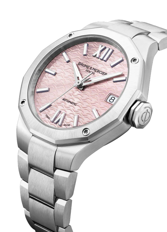 In 2022, Baume & Mercier presents two new, ultra-feminine versions of the Riviera, each in an elegant 33 mm diameter, with a “Swiss-made self-winding movement and an interchangeable integrated steel bracelet. The first is adorned with a pink “sun satin dial, while the second asserts a white mother-of-pearl dial. The new palette of 33 mm ladies’ Riviera watches keeps it pared down to the essential: assertive femininity, supreme style and natural flair. The polished / satin-finished strap – featuring a reliable, robust interchangeability system for use without tools – makes it possible to change looks on a whim. Each one is trustworthy, athletic, elegant and authentic. Each is distinctive of the Riviera style. For today’s woman.