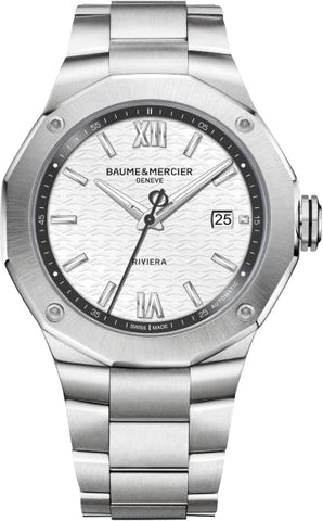 The history of the Riviera watch collection by Baume et Mercier makes for a compelling narrative, particularly if heritage and storytelling are important to you in a watch. Contributing to the integrated steel sports watch trend, Baume et Mercier put a vision into reality back in 1973 when it launched the Riviera sports watch. Over the years, the collection, including models like this reference 10829, has evolved without losing any of its character and lasting charm. Today it features the unmistakable dodecagonal bezel, a wave effect dial, and a reliable aromatic movement to take you from Monday through Sunday. This watch features a white wave effect dial with a black minute track on the flange, luminous hour markers and hands, and a black central seconds hand.