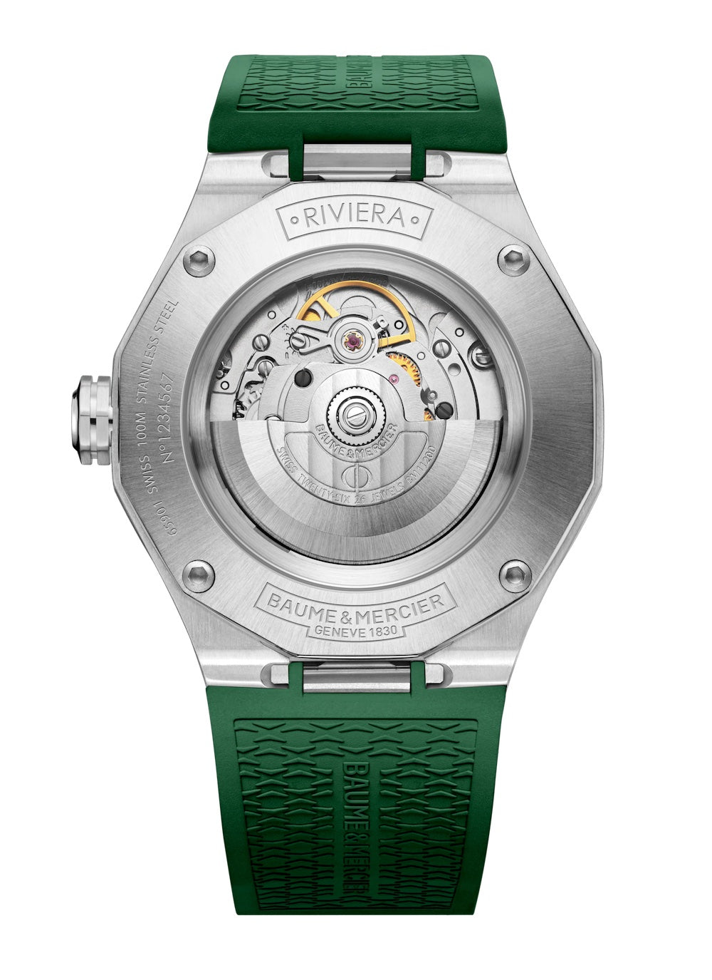 Returning to the aesthetics of its 1970’s predecessor, this Baume et Mercier Riviera Mens watch is dressed in classic stainless steel and incorporates the iconic dodecagonal bezel decorated with four screws and an integrated green rubber strap. It’s 42mm diameter is also home to a unique textured green dial which is designed to symbolise the convergence of the mountains and the ocean. Around its circumference the dial showcases large applied indexes and Roman numerals at 12 and 6 o’clock and a date aperture at 3 o’clock while at the centre, the Swiss mechanical movement ensures optimal precision of Superluminova rhodium plated hour and minute hands and a slender seconds hand. The Baume et Mercier Riviera Baumatic watch also delivers a 100 metre water resistance rating, an exhibition case back and an adjustable folding buckle with security push pieces.
