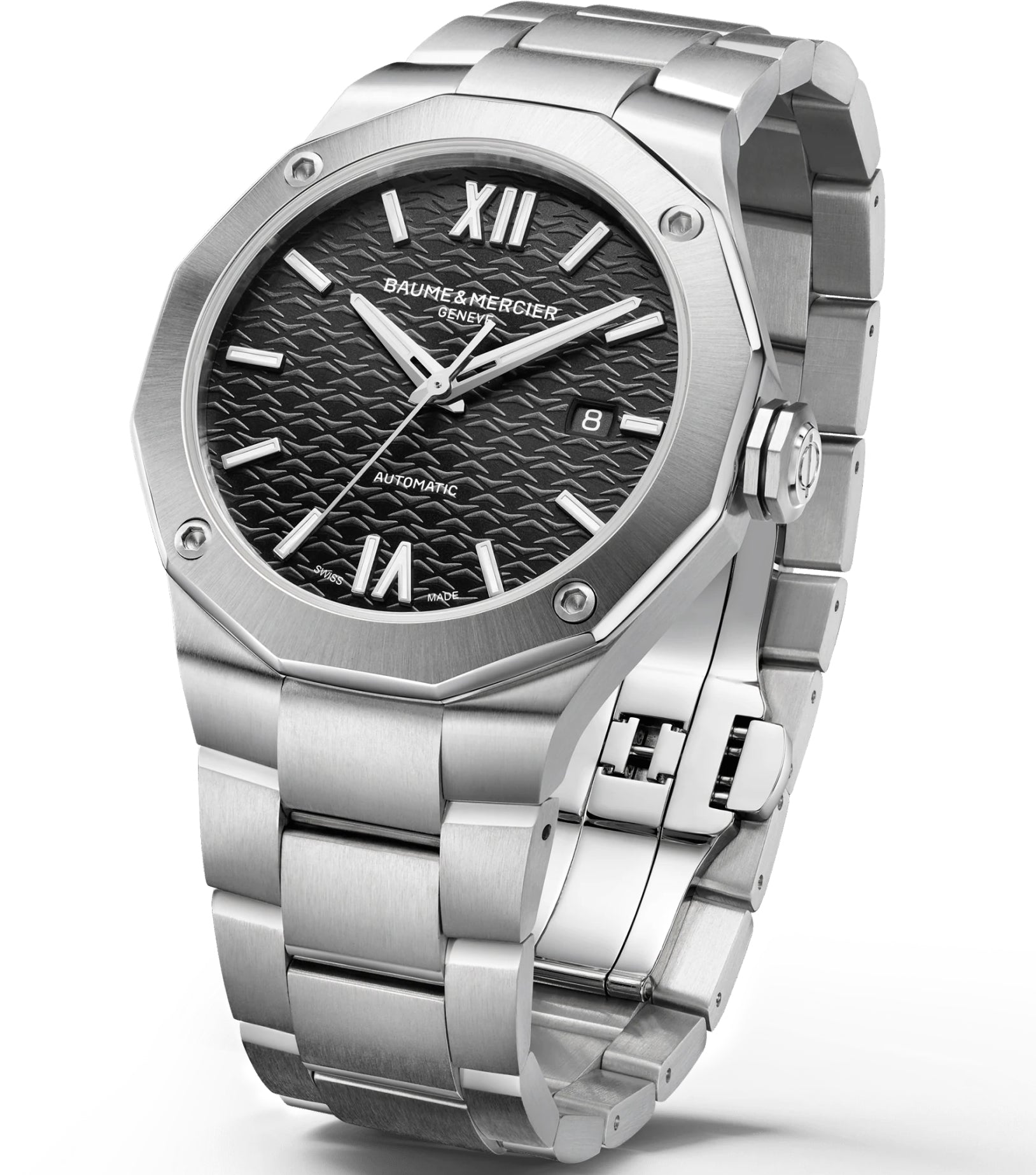 The men’s 42mm Baume & Mercier Riviera automatic watch is powered by the Sellita SW 200 movement, a La Chaux de Fonds movement capable of performing at a rate of 28,800 beats per hour and offering a running time of 38 hours once off the wrist. The decoration of the movement in motion can be admired through a transparent sapphire crystal glass caseback. The 100 meter water resistant Baume & Mercier Riviera watch is part of the fifth generation of the iconic collection and comes with an integrated stainless steel bracelet with links finished in polished and brushed surfaces.