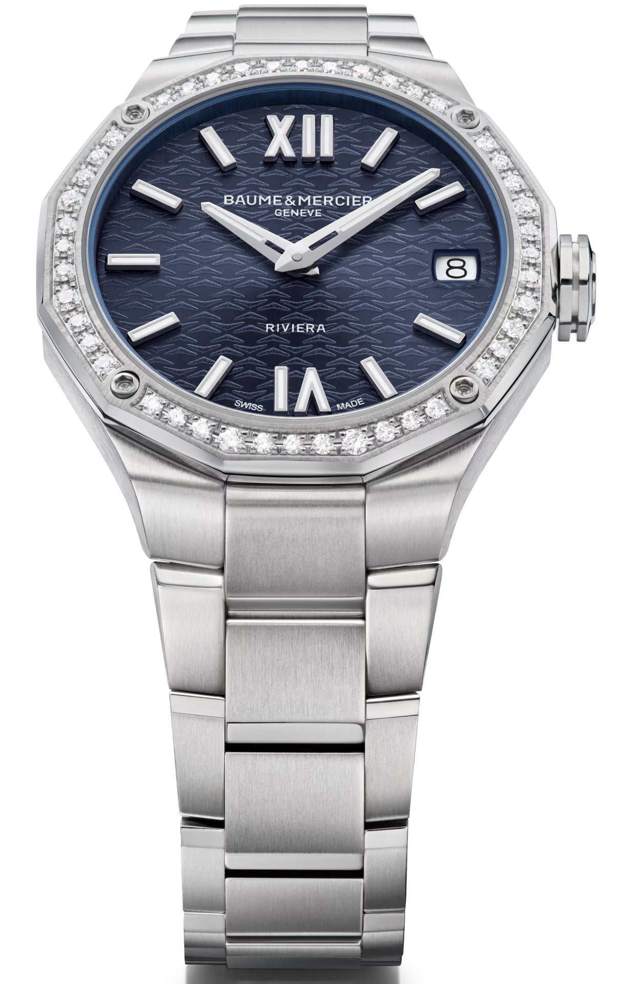 Baume et Mercier Watch Riviera Quartz Diamond 10765. The Riviera 10765 shines like any other. Equipped with a sun satin-finished and polished stainless steel bezel set with 44 diamonds, this timepiece features a night blue dial and transparent waves decor. With the addition of its metal bracelet, this timepiece is a symbol of refinement.