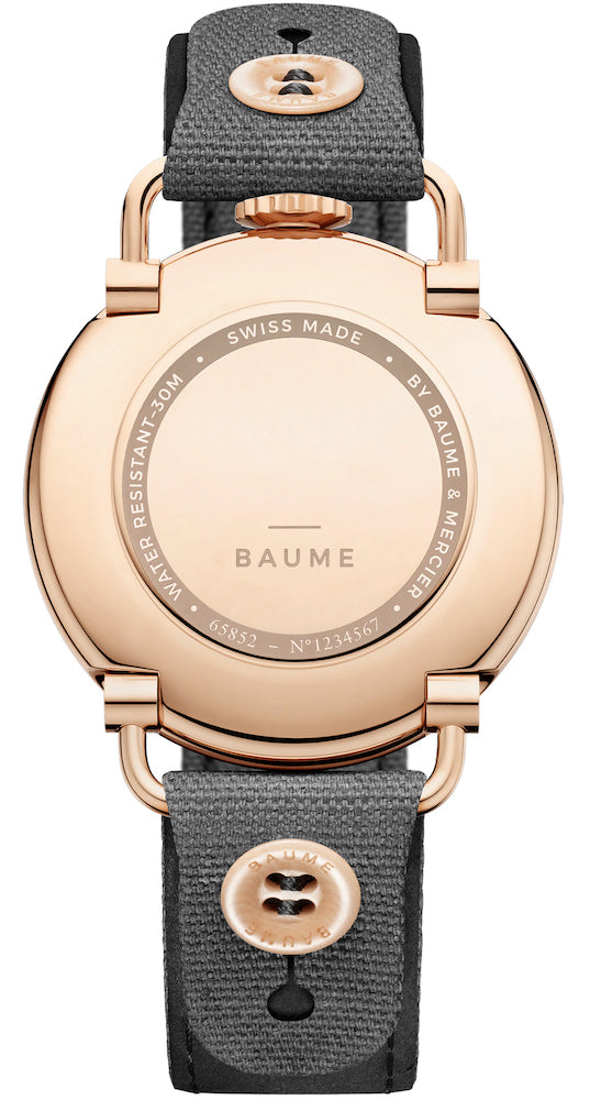 The strap of this Baume et Mercier Baume watch is completely interchangeable thanks to the recycled button system so you can easily swap out the grey cotton strap for something even more daring. The women’s timepiece is also equipped with black baton-shaped hands for hours and minutes, a rose gold small seconds hand and small Arabic numerals for a contemporary, minimalist finish. The case measures to 41 millimetres in diameter and is engineered entirely from rose gold PVD steel, including the movable lugs, closed case back and knurled crown at 12 o’clock. The Baume ladies watch sits only 7.56 millimetres high on the wrist and delivers a handy 30 metres water resistance. Housed within is the Ronda 6004 D quartz movement, a Swiss made calibre which promises a variation of only a few seconds per month.