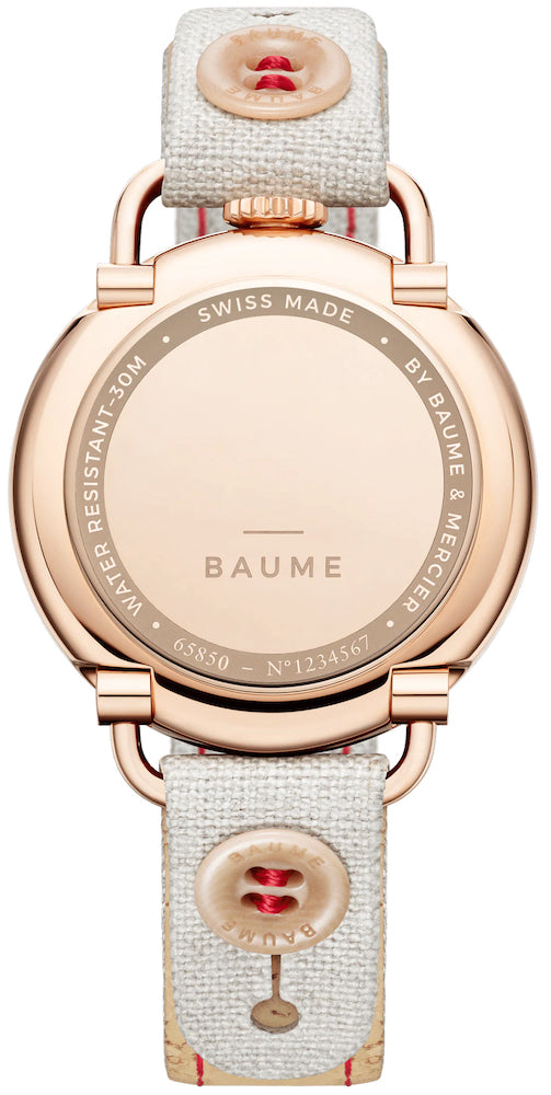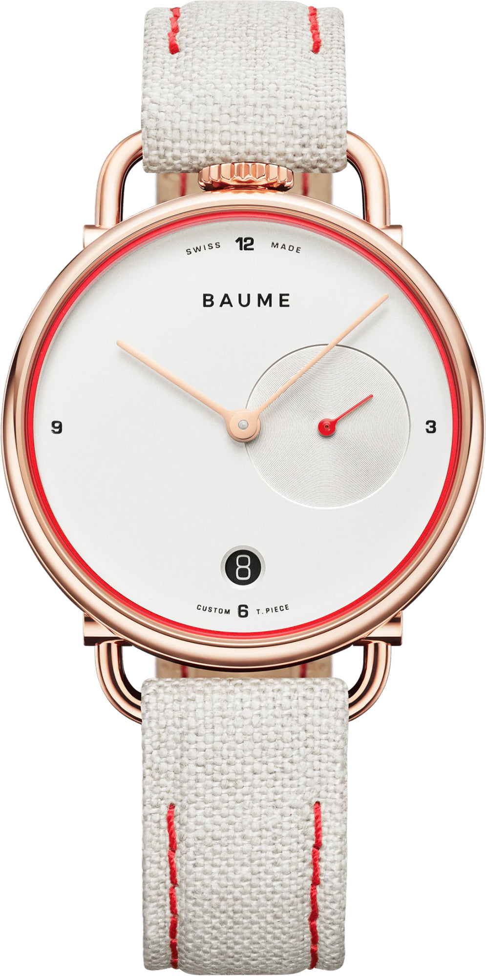 Baume et Mercier expand their luxury watch collections with the Baume series, a family of stunning dress watches which focus on three design codes: moving lugs for better comfort, an interchangeable lined strap with cork for comfort and an off-centre crown at 12 o’clock which takes inspiration from some of the Swiss watch manufacturer’s earliest creations, the pocket watch. This particular ladies Baume quartz watch calls for attention with its exquisite white and red colourway. The dial is dressed in a beautiful white opaline finish with a matching white snailed small seconds counter at 3 o’clock and a natural cotton strap lined with cork. In contrast, a shade of red is incorporated around the flange, on the seconds hand and through the stitching on the strap.