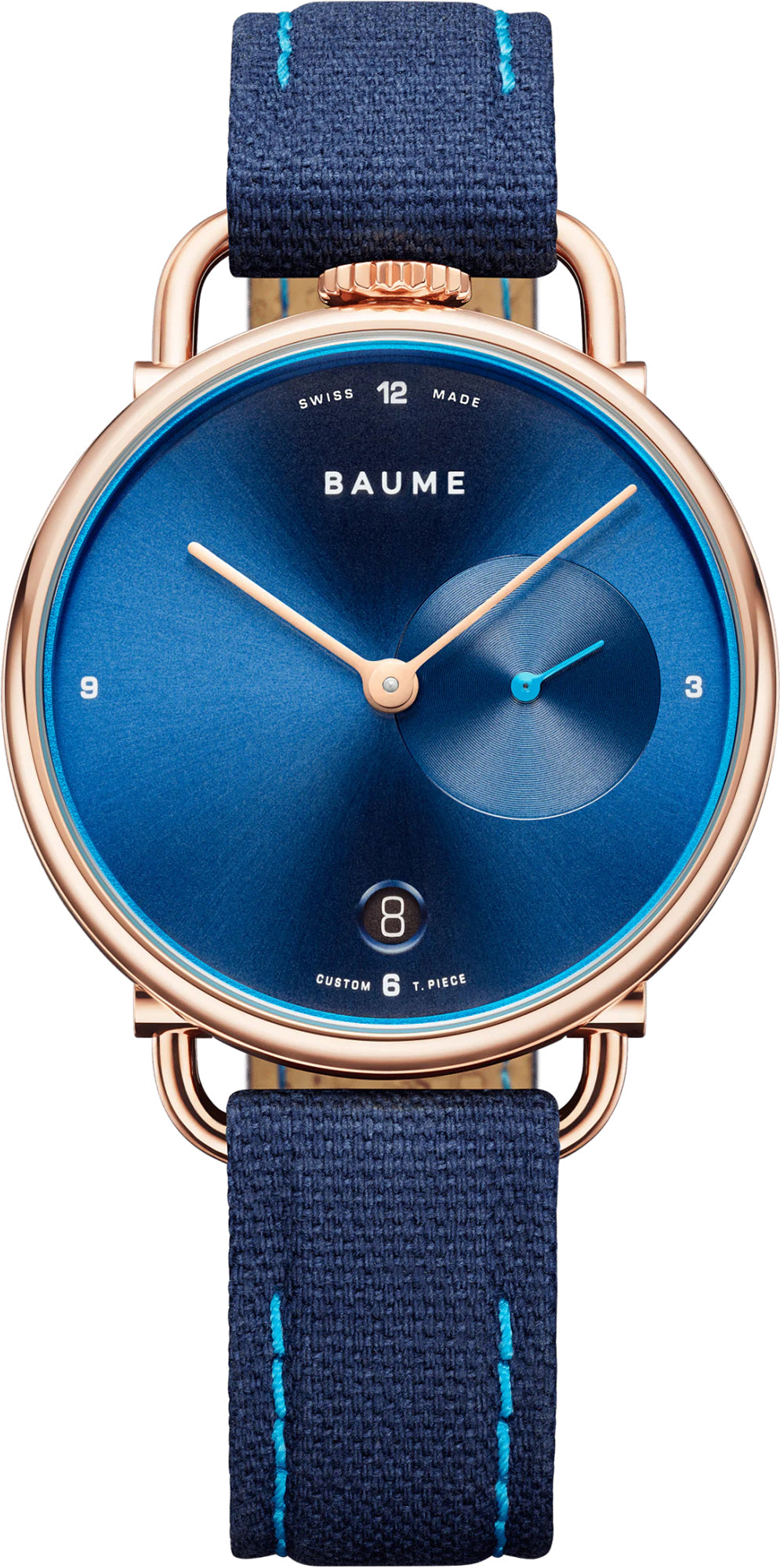 Baume et Mercier expand their luxury watch collections with the Baume series, a family of stunning dress watches which focus on three design codes: moving lugs for better comfort, an interchangeable lined strap with cork for comfort and an off-centre crown at 12 o’clock which takes inspiration from some of the Swiss watch manufacturer’s earliest creations, the pocket watch. This particular ladies Baume quartz watch calls for attention with its exquisite all-blue colourway. The dial is dressed in a beautiful shade of navy blue with a sunray satin finish with a matching blue snailed small seconds counter at 3 o’clock and a navy blue cotton strap lined with cork. To pair, a second shade of teal blue is incorporated around the flange, on the seconds hand and through the stitching on the strap.