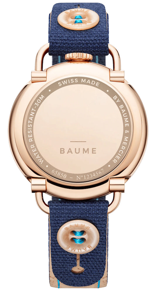 The strap of this Baume et Mercier Baume watch is completely interchangeable thanks to the recycled button system so you can easily swap out the blue cotton strap for something even more daring. The women’s timepiece is also equipped with rose gold baton-shaped hands for hours and minutes, a rounded date window at 6 o’clock and small Arabic numerals for a contemporary, minimalist finish. The case measures to 35 millimetres in diameter and is engineered entirely from rose gold PVD steel, including the movable lugs, closed case back and knurled crown at 12 o’clock. The Baume ladies watch sits only 7.56 millimetres high on the wrist and delivers a handy 30 metres water resistance. Housed within is the Ronda 6004 D quartz movement, a Swiss made calibre which promises a variation of only a few seconds per month.