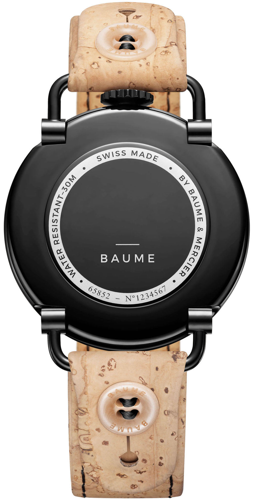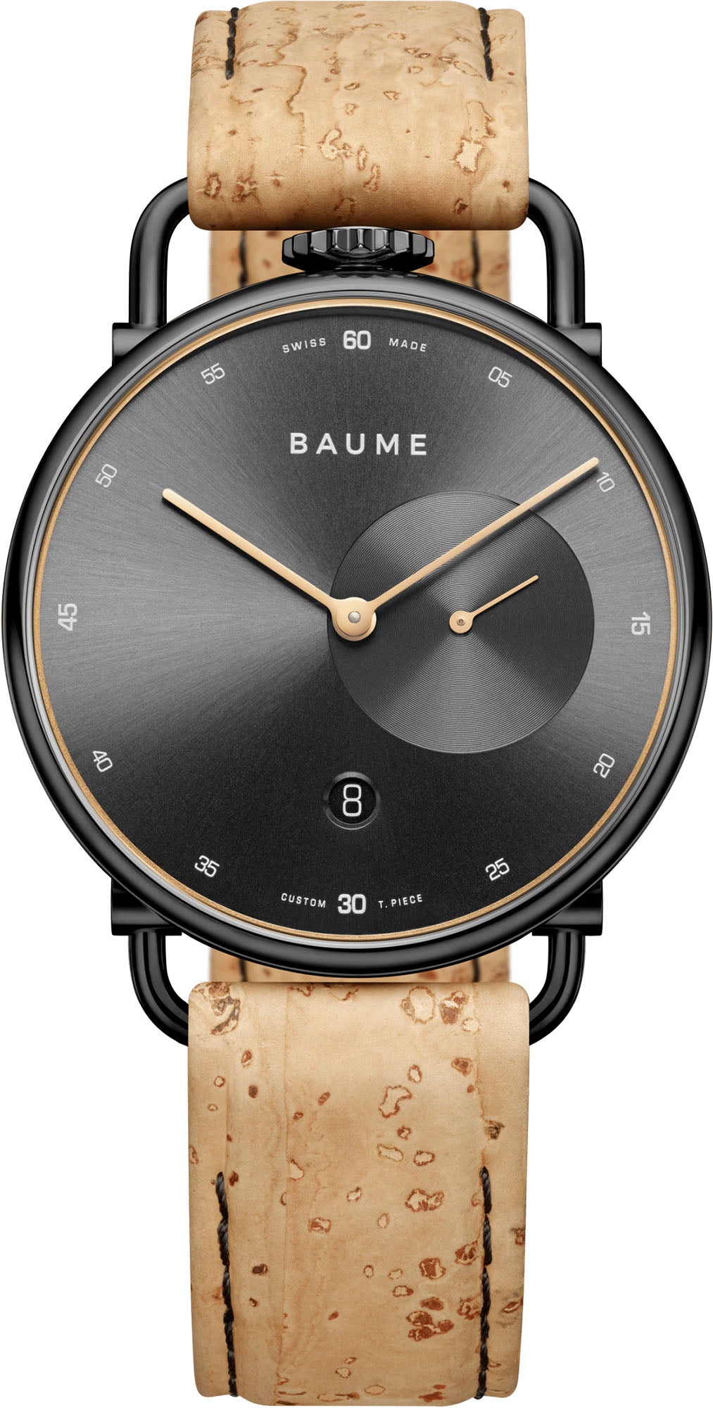 Baume Watch Quartz M0A10686. This BAUME watch is a 41mm timepiece featuring a steel black PVD case and a slate-grey dial coupled with a gilt bevel and second hand. Its interchangeable strap is crafted in natural cork and features a black pin buckle.
