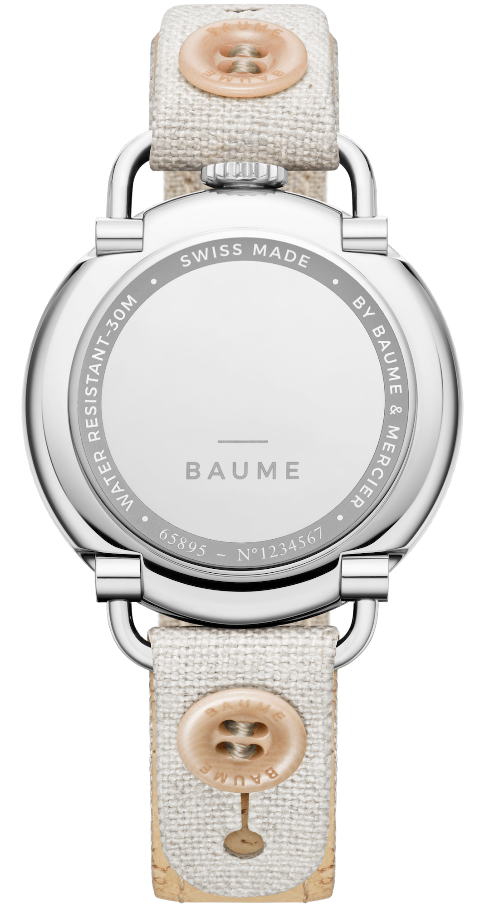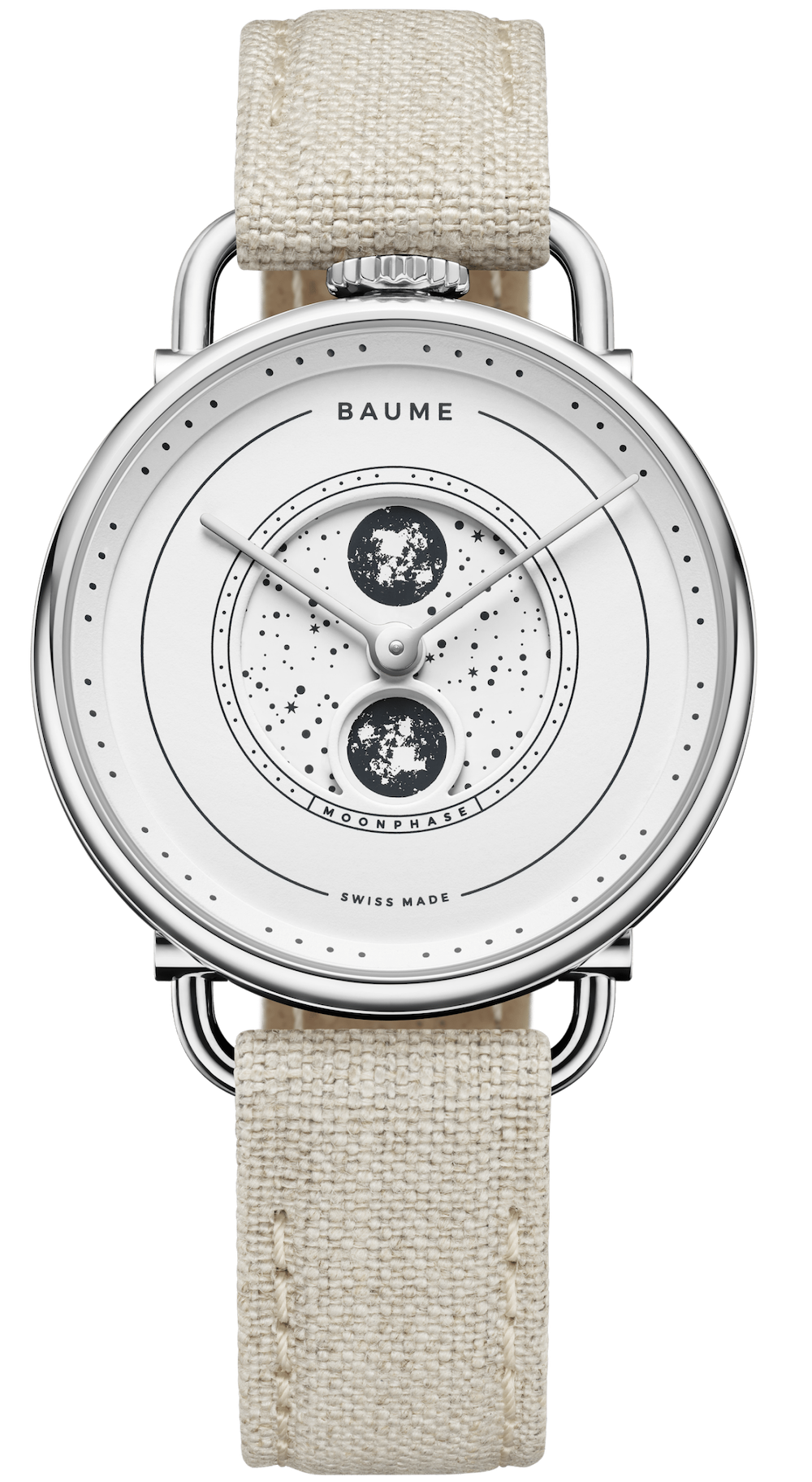 Baume Watch Quartz Moonphase M0A10639. This Baume timepiece features a round polished steel case with a crown at 12 o clock, articulated horns and a interchangeable strap system with a button. This timepiece feature a mat white dial adorned with a unique moon phase disc. It is mounted on a linen strap.