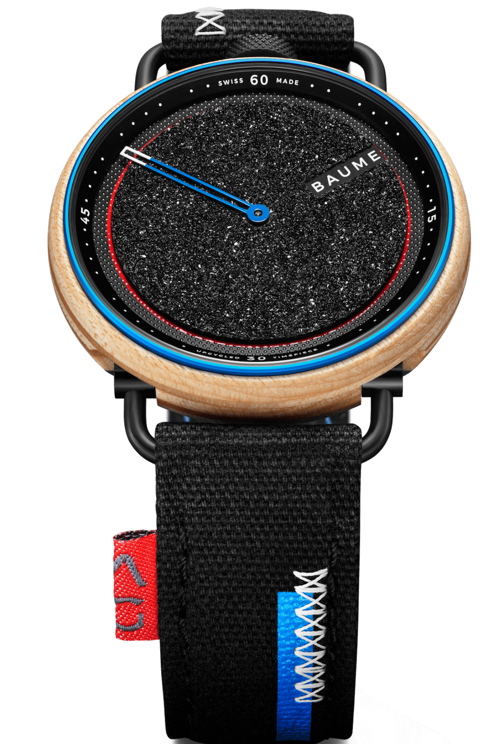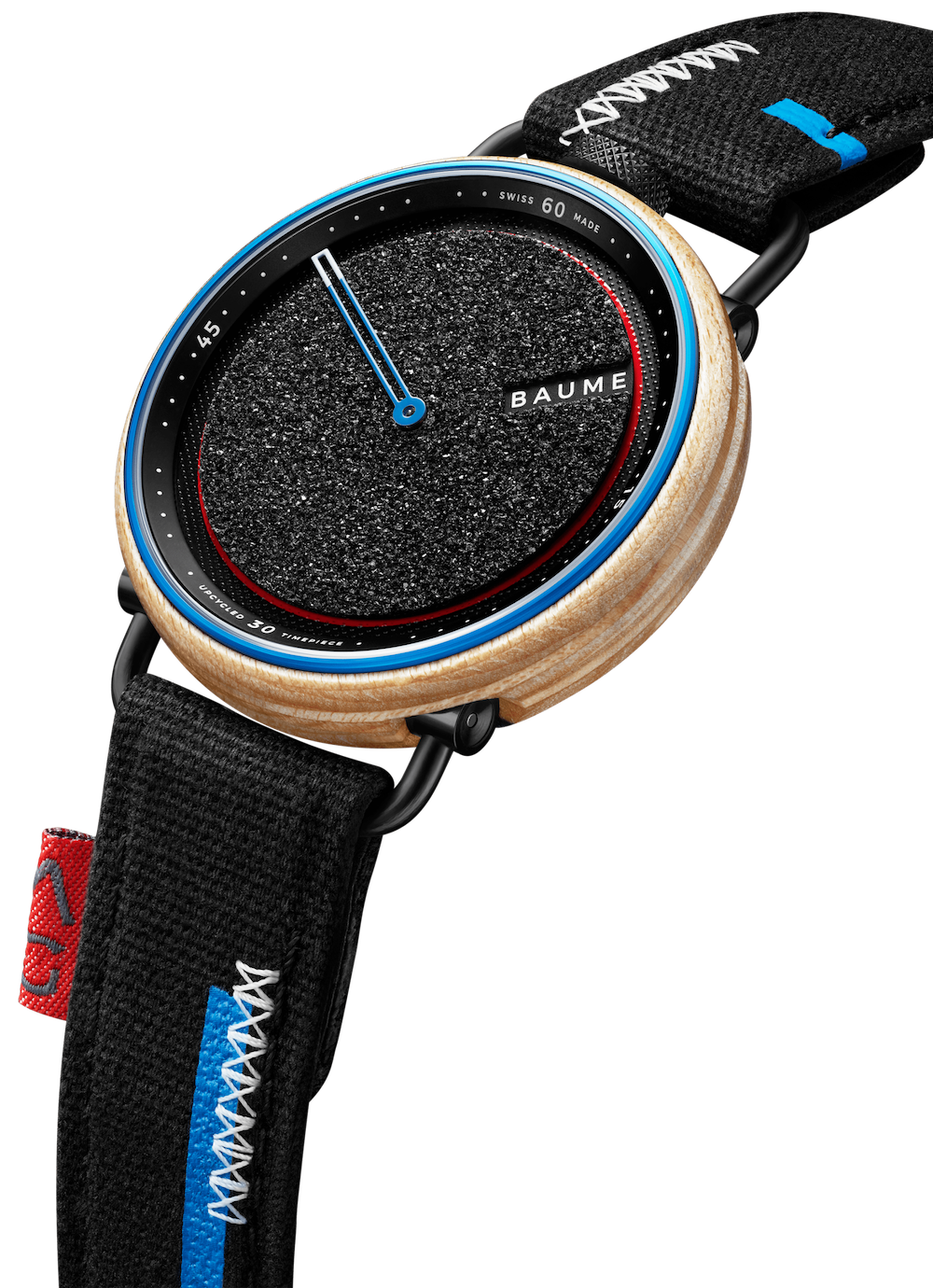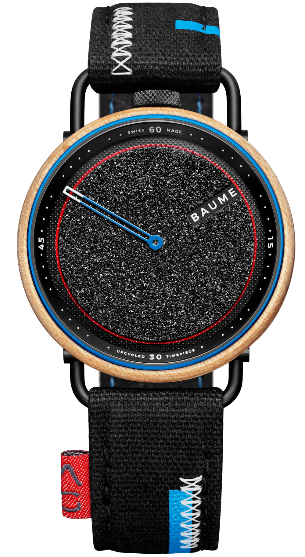 Baume Watch Skate Aurelien Giraud Special Edition M0A10653. he Baume Skate - Aurelien Giraud Special Edition is a unique timepiece based on upcycling. It features a case made out of skate decks, a dial using skate grip tape and is mounted on a black cotton strap with tag and overlays. The perfect timepiece for skateboard afficionados, curated by Aurelien Giraud himself.