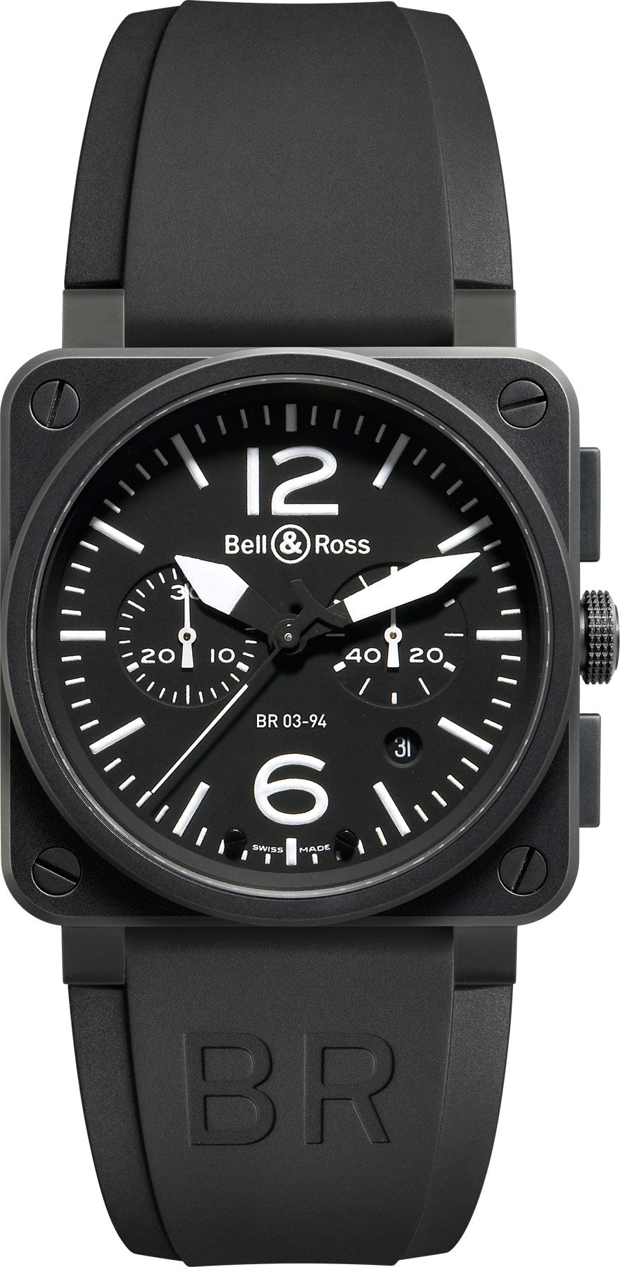 Bell & Ross Watch BR 03 . The BR 03 instrument watch is not exclusively reserved for professional users and has become an iconic watch for numerous collectors. Fitted with a high quality Swiss movement, this Bell & Ross instrument watch designed for professionals asserts its utilitarian and functional purpose by embodying four fundamental principles, legibility, functionality, precision, and reliability. It is 42 mm diameter and adapts to all sizes. This new ceramic model once again emphasizes the Bell & Ross brands pioneering vision. By associating a high tech material with fine craftsmanship, Bell & Ross has created a new instrument with innovative properties. The BR 03 is an icon that pushes the boundaries of resistance over time.