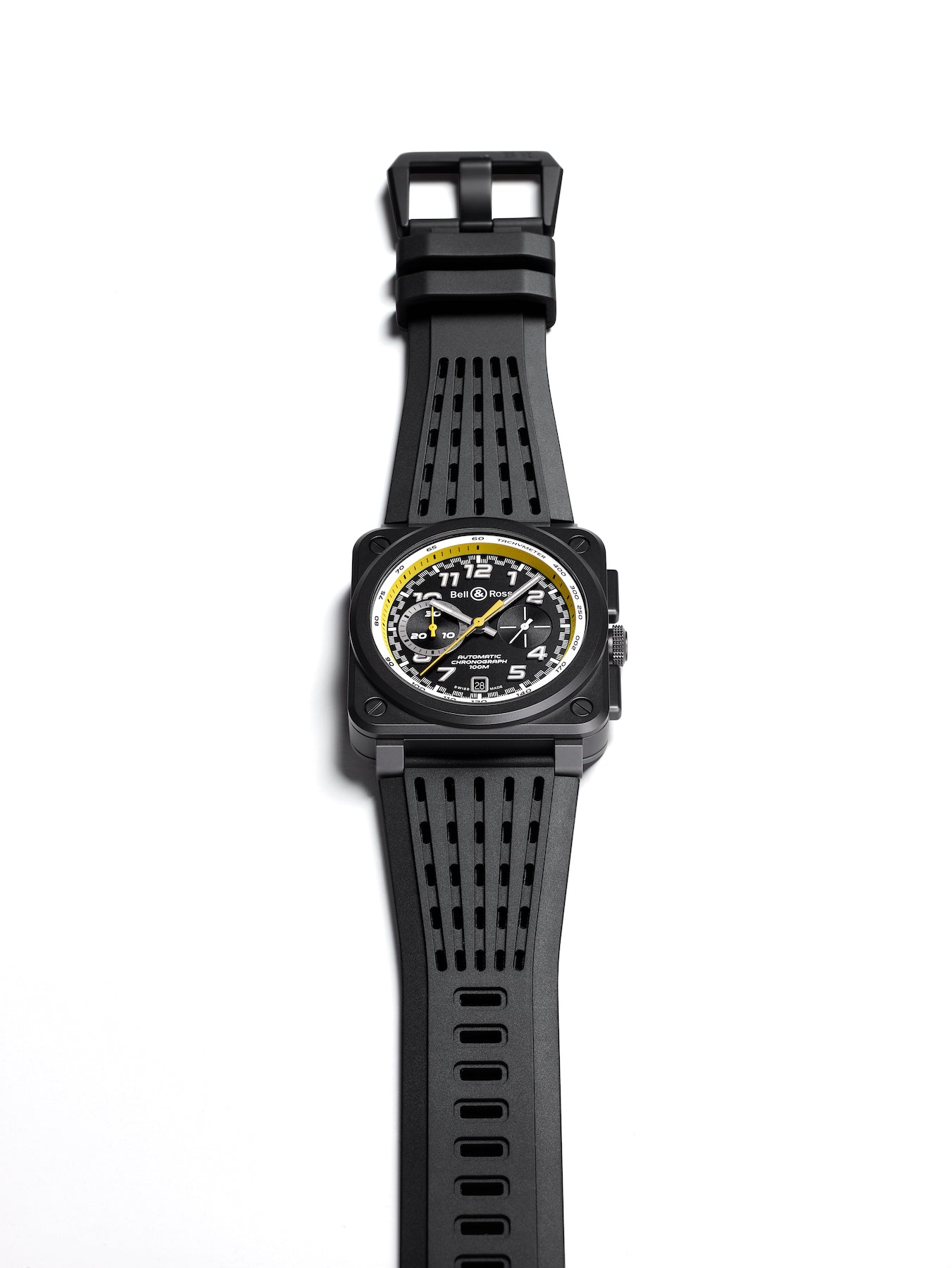 This breathtaking Bell and Ross R.S.20 Limited Edition watch boasts an aesthetic inspired by the world of motor racing with a 42mm black ceramic case, tachymeter scale on the flange and a closed case back engraved with a Formula 1 Renault R.S.20 decoration. Hidden within the case is the BR-CAL.301 automatic winding movement which powers the central hands for hours, minutes and chronograph seconds, small seconds at 3 o clock, date and 30 minute counter at 9 o clock. The unmissable black matte dial takes inspiration from the colourful aesthetics of the Renault F1 cars and showcases bold yellow accents, metal skeletonised Superluminova filled hands and large metal applique indices for ultimate legibility.