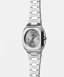 Allow the angular case finishes of the 40mm Bell & Ross BR 05 Grey Steel watch reference BR05A-S-GR-ST/SST to draw you in with its satin finished surfaces, perfectly flat planes, and polished bezels. This sporty model, renowned for its comfortable integrated stainless steel bracelet, aligns all components seamlessly as a unified, masculine piece. In line with the brand’s visual identity, its graphic style, both striking and modern, imparts the time via a stunning sunray grey dial with applique numerals and indices, Super LumiNova coated hands, and a crisp date window at 3 o’clock.