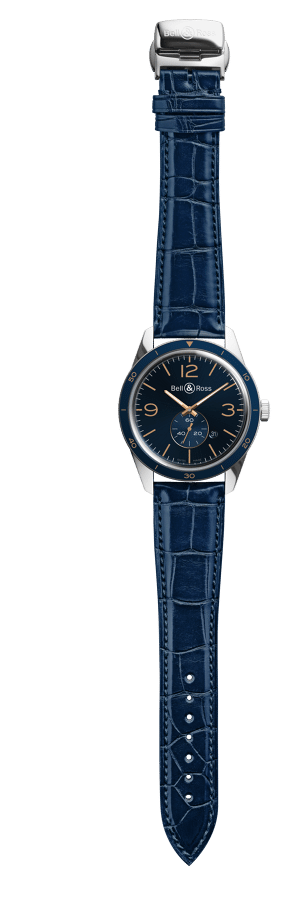 The breath taking deep blue sunray dial of this Bell and Ross BR 123 Aeronavale watch is decorated with gilt applique numerals and indices and gilt skeleton superluminova filled hour and minute hands for effortless legibility. The dial is protected by scratch resistant sapphire crystal glass that can also withstand up to 100 metres water resistance. The watch also showcases a small seconds dial at 6 o clock and a date aperture at 4 o clock. To complete the look of this timepiece, a luxurious blue calfskin leather strap is added with a polished stainless steel folding buckle.