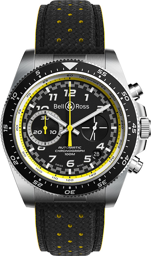 This breathtaking Bell and Ross R.S.20 Limited Edition watch boasts an aesthetic inspired by the world of motor racing with a 43mm satin polished stainless steel case, black aluminium bi-directional rotating bezel, tachymeter scale on the flange and an exquisite sapphire crystal exhibition case back. Displayed proudly through the case back is the BR-CAL.301 automatic winding movement which powers the central hands for hours, minutes and chronograph seconds, small seconds at 3 o clock, date and 30 minute counter at 9 o clock. The unmissable black matte dial takes inspiration from the colourful aesthetics of the Renault F1 cars and showcases bold yellow accents, metal skeletonised Superluminova filled hands and large metal applique indices for ultimate legibility.