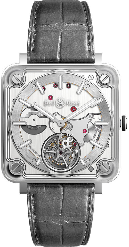 Bell & Ross Watch BR-X2 Tourbillon Micro Rotor Limited Edition BRX2-MRTB-ST. An exceptional timepiece playing with transparency. The movement developed and manufactured for the BRX2 is square and thin, it is called the caliber BR380. With this time piece, Bell & Ross is going extreme into the simplification of watchmaking construction. For BR-X2 Concept it is impossible to talk about a case. Its majesty the movement is not housed in a traditional watch case, it is framed inside a holder. The frame is cut in a solid plate of stainless steel as thin as the movement itself.