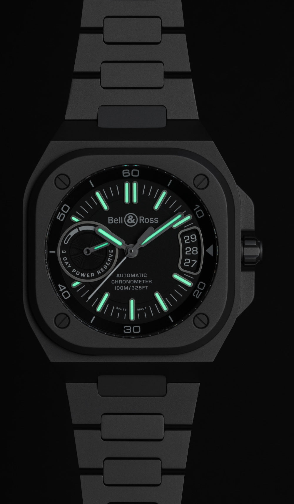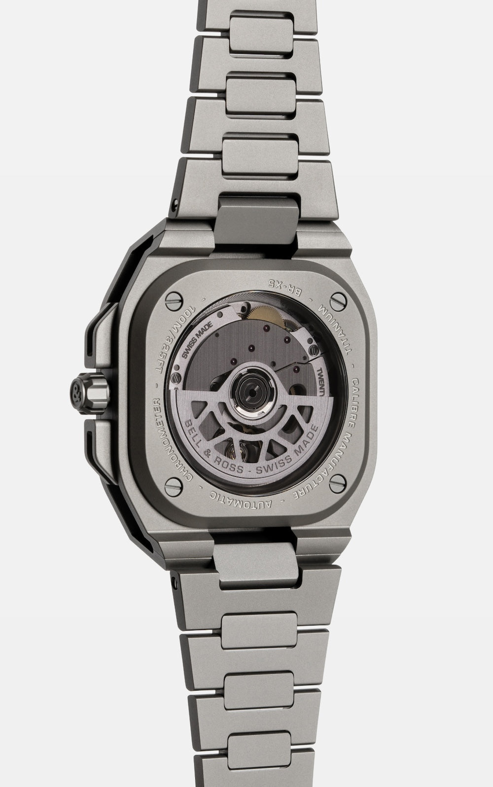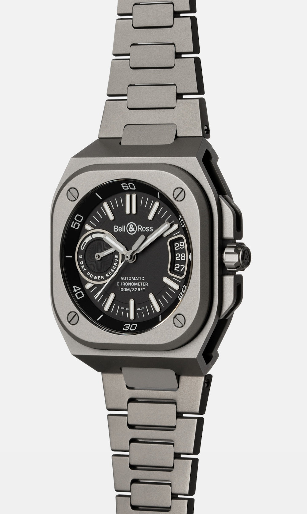 Bell & Ross Watch BR X5 Black Titanium Bracelet BRX5R-BL-TI/STI. Equipped with the BR CAL.323 self winding mechanical movement, the BR X5 Black Titanium guarantees COSC certified chronometer performance. It also offers a power reserve of around 70 hours, as well as a rapid date correction function. Bell & Ross has opted for titanium, a prized material in aeronautics due to its robustness and lightness, at only one third of the weight of steel. Hypoallergenic, non corrosive and non magnetic, titanium delivers both practicality and performance.