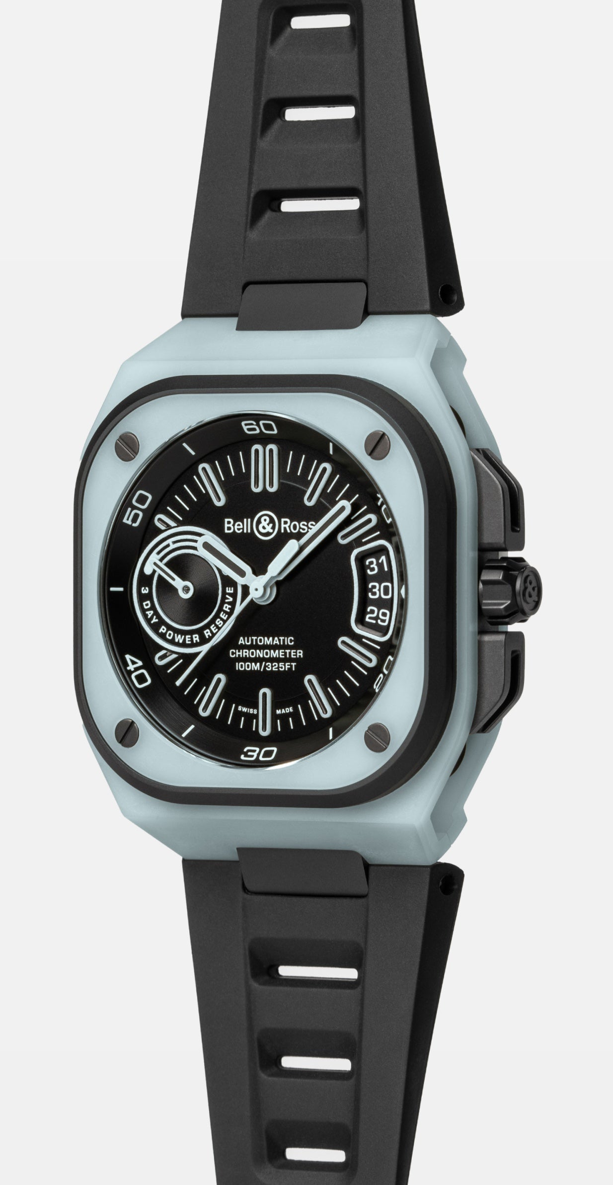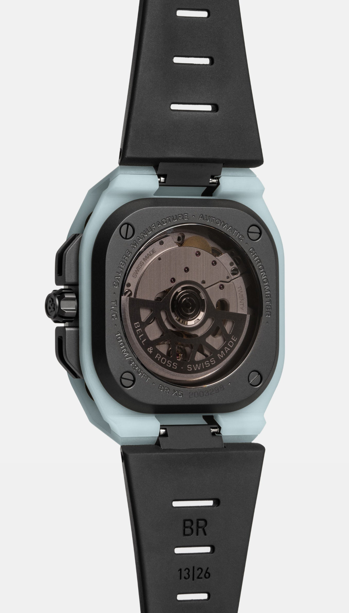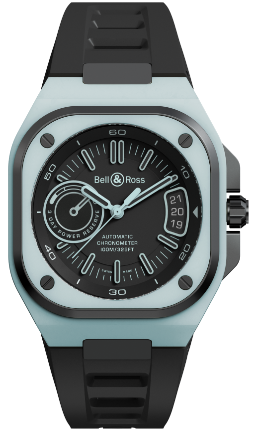 Bell & Ross Watch BR-X5 Blue LUM Limited Edition BRX5R-BLUM-TC/SRB. Bell & Ross has revolutionised luminescence by transforming it into a veritable aesthetic signature. Since 2017, the Lum collection has been exploring new horizons with innovative materials such as Super-LumiNova. In 2023, the BR-X5 Green Lum pushed the limits of this technology even further with an entirely luminescent case, created using the exclusive composite LM3D. In 2024, a new version, the BR-X5 Blue Lum, will complete this offering, emitting a striking blue glow.
