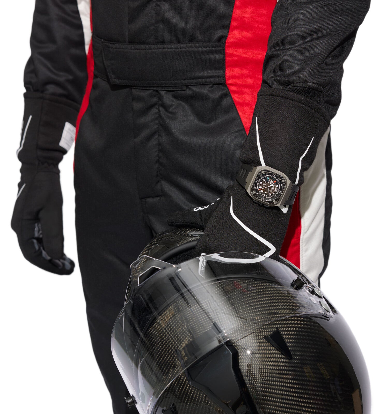 Bell & Ross Watch BR-X5 Racing Rubber Limited Edition BRX5R-RAC-TI/SRB. If a watch inspired by the world of motorsports aims to combine performance, robustness, readability, and lightness, it is through its design that it truly reaches the hearts of speed enthusiasts. Thanks to its eight years of experience in motor sport, Bell & Ross's expertise in high end watchmaking has enabled the creation of an unprecedented pilots watch that breathes the oxygen of competition. This BR-X5 Racing, with a particularly powerful design faithful to the BR-X5 collections specificities, owes its strength and lightness to the use of high tech materials, and its precision to an in-house automatic movement.