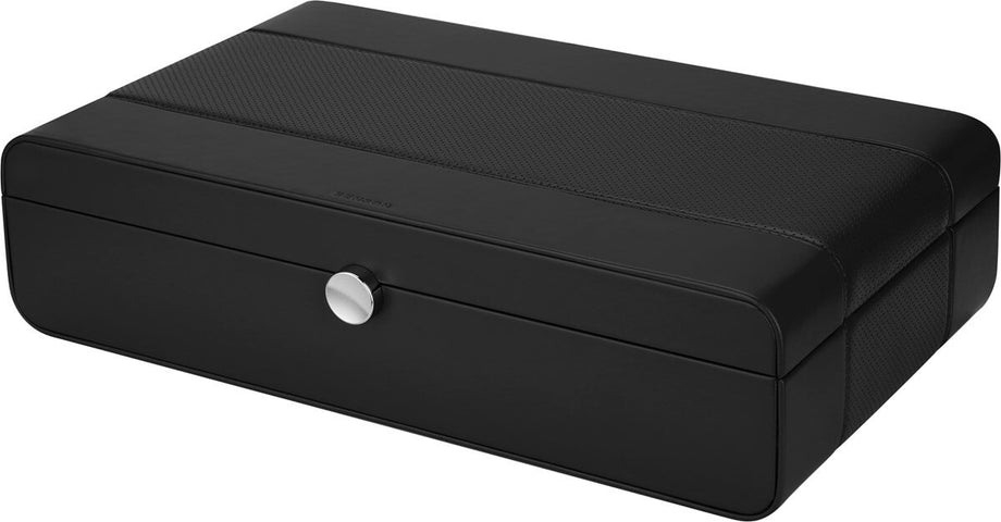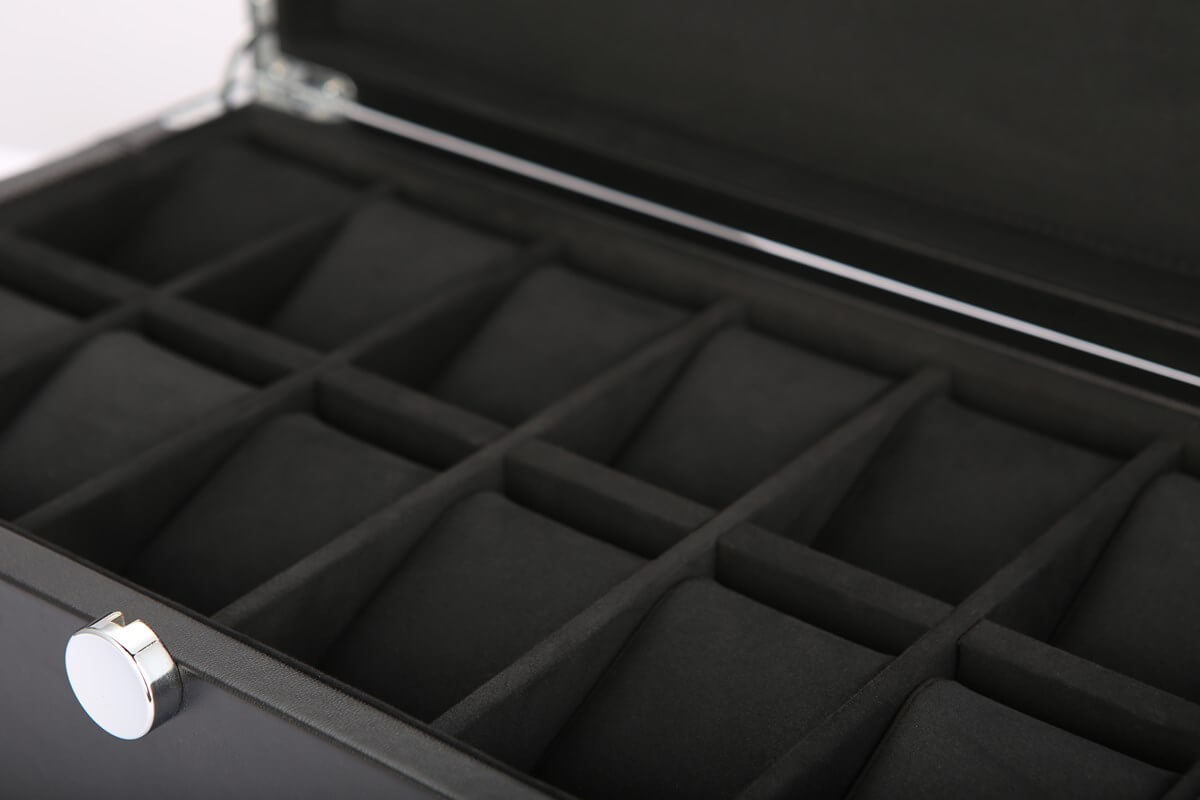 Benson Watch Case Black Series LWB.12 Black Black Series LWB.12 Black. The Benson Black Series watch boxes offer an extremely luxurious and convenient storage place for all types of watches. These watch boxes are made of leather and available in the colors black, dark brown, blue and carbon fiber. This Benson Black Series LWB.12 Black watch box is suitable for storing 12 watches. The inside of the watch box is covered with soft fabric for optimal protection of the watches. The lock on the front ensures that you can also close the watch box. The beautiful finish is reflected in the fine stitching and logo stamped in the leather. The Benson Black Series LWB.12 Black watch box comes with a 2 year warranty, certificate and Black Series carton box.