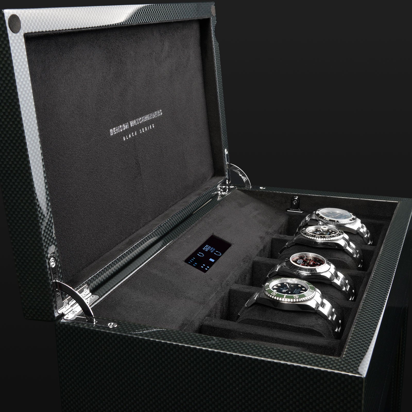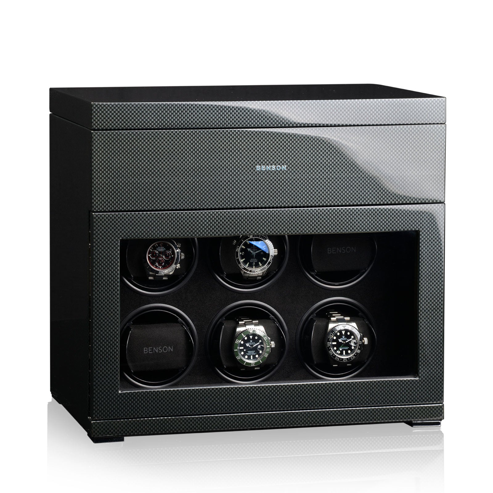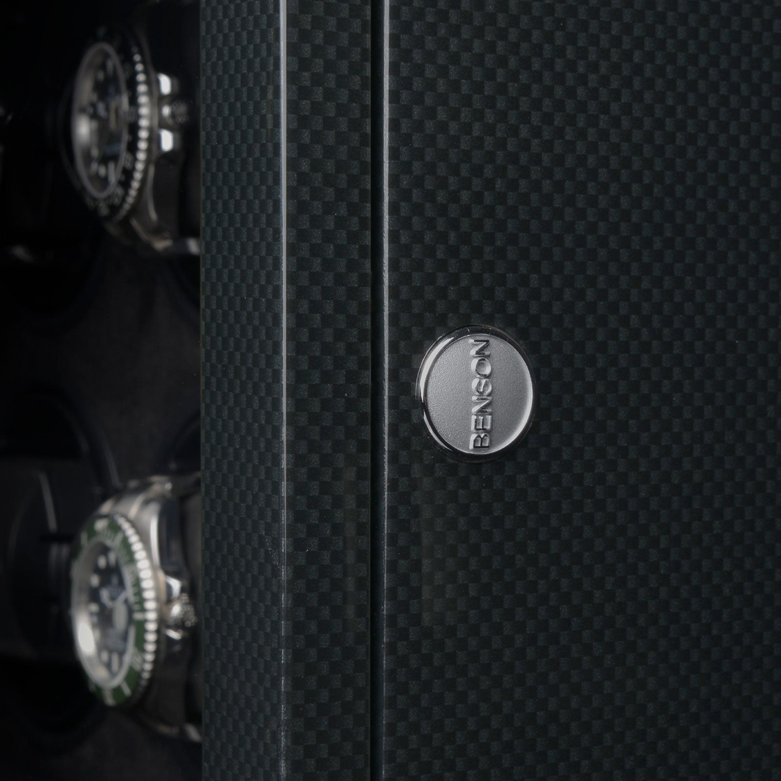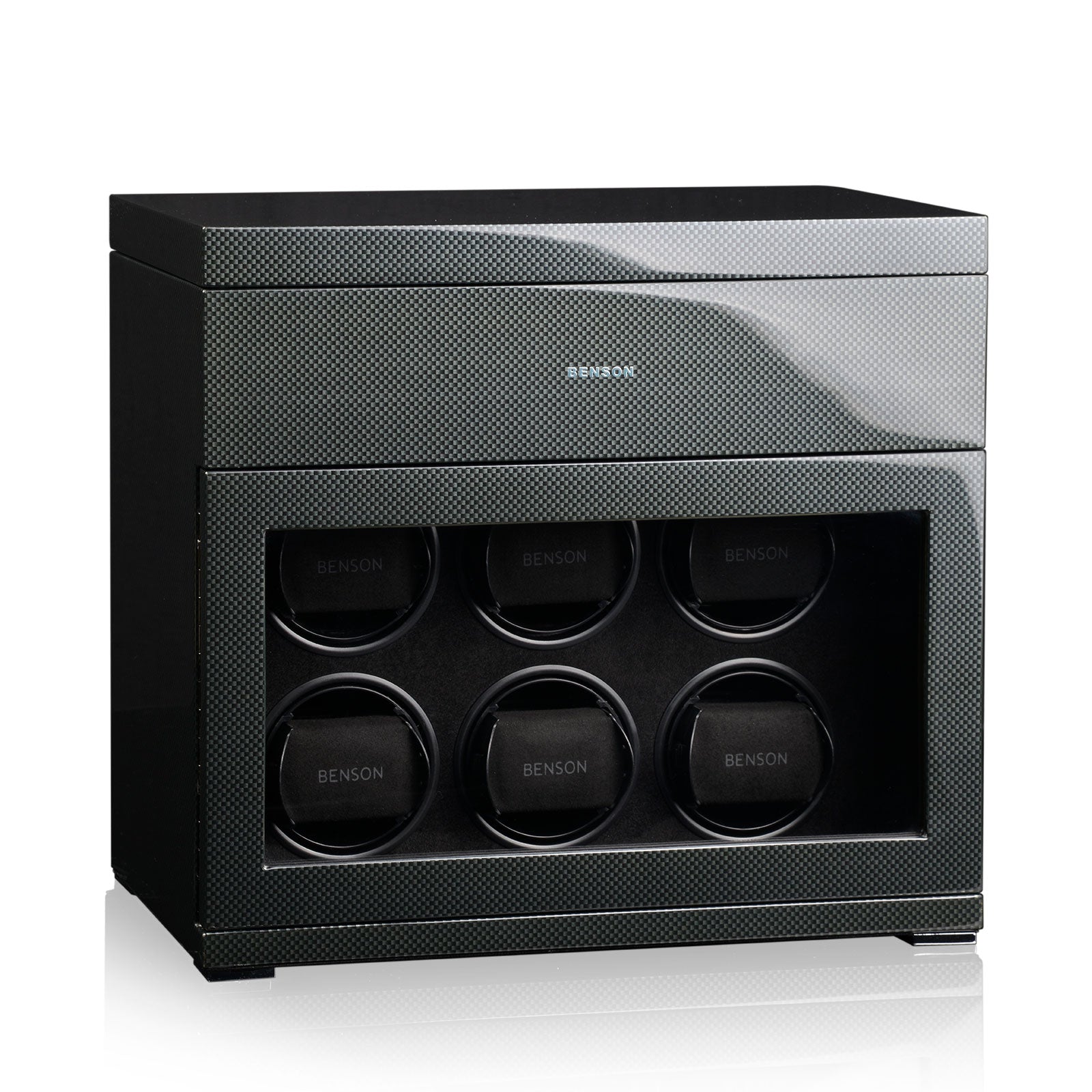 Benson Watch Winder Black Series 6.16 CF Carbon 70048-104.17. Benson watchwinders are essential accessories for automatic watches. A watchwinder provides the watch of energy, prevents wear, ensures optimum oil circulation and is a perfect storage method for your watches. We produce the Benson Watchwinders in house. This means that we optimally focus on the design, materials, technical innovations and finishing which leads to quality products. The words quality, innovation and craftsmanship do stand for our watchwinders.