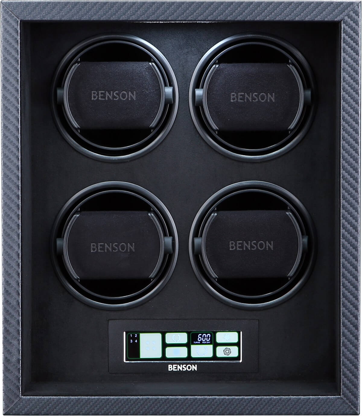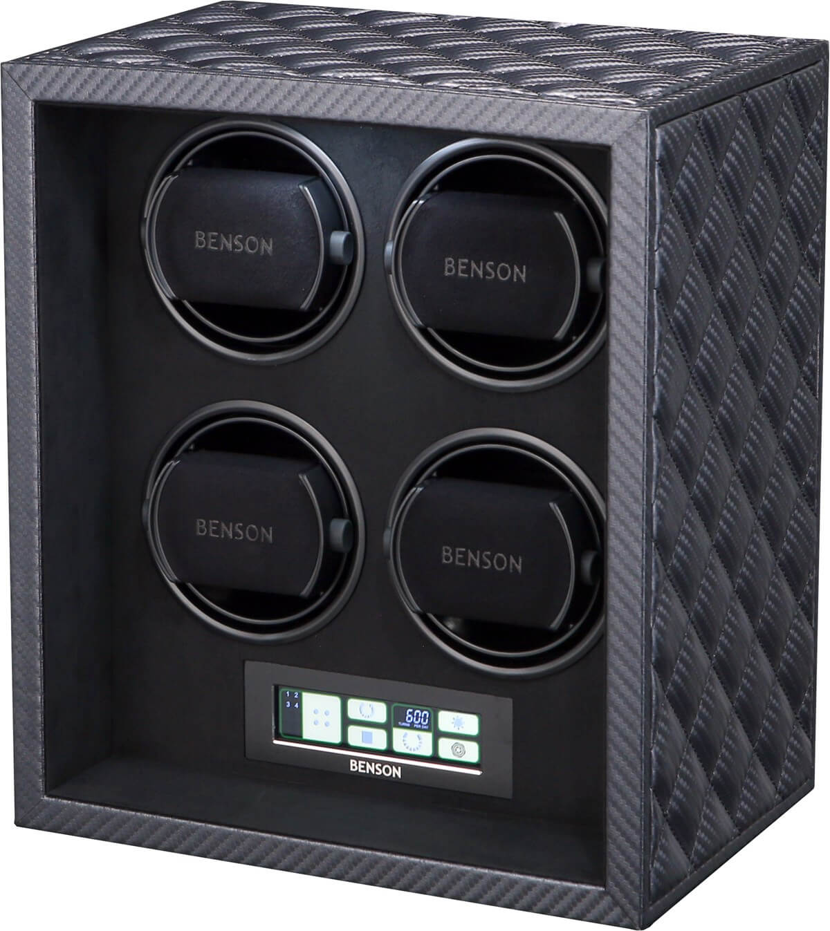 Benson Watch Winder Black Series Leather 4.22.CF Carbon Fibre Black Series Leather 4.22.CF Carbon Fibre. The Benson Black Series Leather watch winders belong to the newest generation of this Dutch brand. The collection contains models for winding 4, 6 and 8 automatic watches and is available with a black leather or carbon fiber leather exterior. The beautiful exterior has padded leather for an extra chic look. This Benson Black Series Leather 4.22.CF watch winder is suitable for winding 4 automatic watches and equipped with a carbon fibre padded leather, touchscreen, LED lighting and flexible watch holders. You can wind any automatic watch in this watch winder, regardless of brand or model. Because the TPD (turns per day) and the direction of rotation can be set per watch, you are completely flexible. The Benson Black Series Leather 4.22.CF watch winder comes with a 2-year warranty, certificate, adapter and manual.