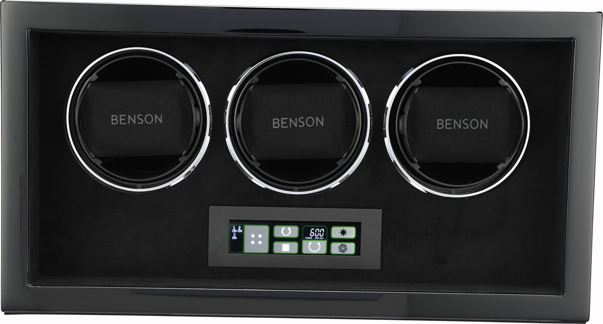 Benson Watch Winder Compact Triple 3.CF Carbon Compact Triple 3.CF. This Benson Compact Triple 3.CF watch winder is modern and compact in shape and offers everything you need to properly wind an automatic watch. The Benson Compact watch winders are available for 1, 2 and 3 watches and are equipped with a Japanese motor and with a touchscreen with which you can set the watch winder. Each rotor can be individually set in terms of direction of rotation and number of revolutions per day (TPD). This makes this Benson Compact Triple 3.CF watch winder suitable for any automatic watch. The flexible watch holders ensure that any watch, large or small, can be clicked into the watch winder.