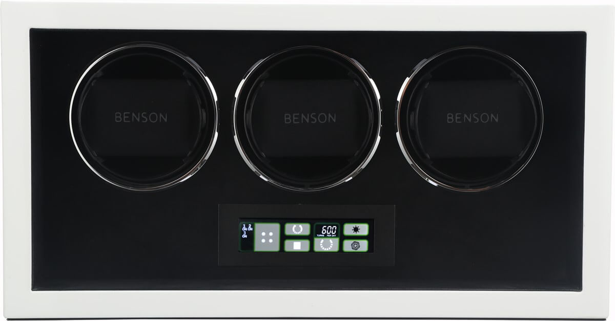 Benson Watch Winder Compact Triple 3.WS White Compact Triple 3.WS. This Benson Compact Triple 3.WS watch winder is modern and compact in shape and offers everything you need to properly wind an automatic watch. The Benson Compact watch winders are available for 1, 2 and 3 watches and are equipped with a Japanese motor and with a touchscreen with which you can set the watch winder. Each rotor can be individually set in terms of direction of rotation and number of revolutions per day (TPD). This makes this Benson Compact Triple 3.WS watch winder suitable for any automatic watch. The flexible watch holders ensure that any watch, large or small, can be clicked into the watch winder.