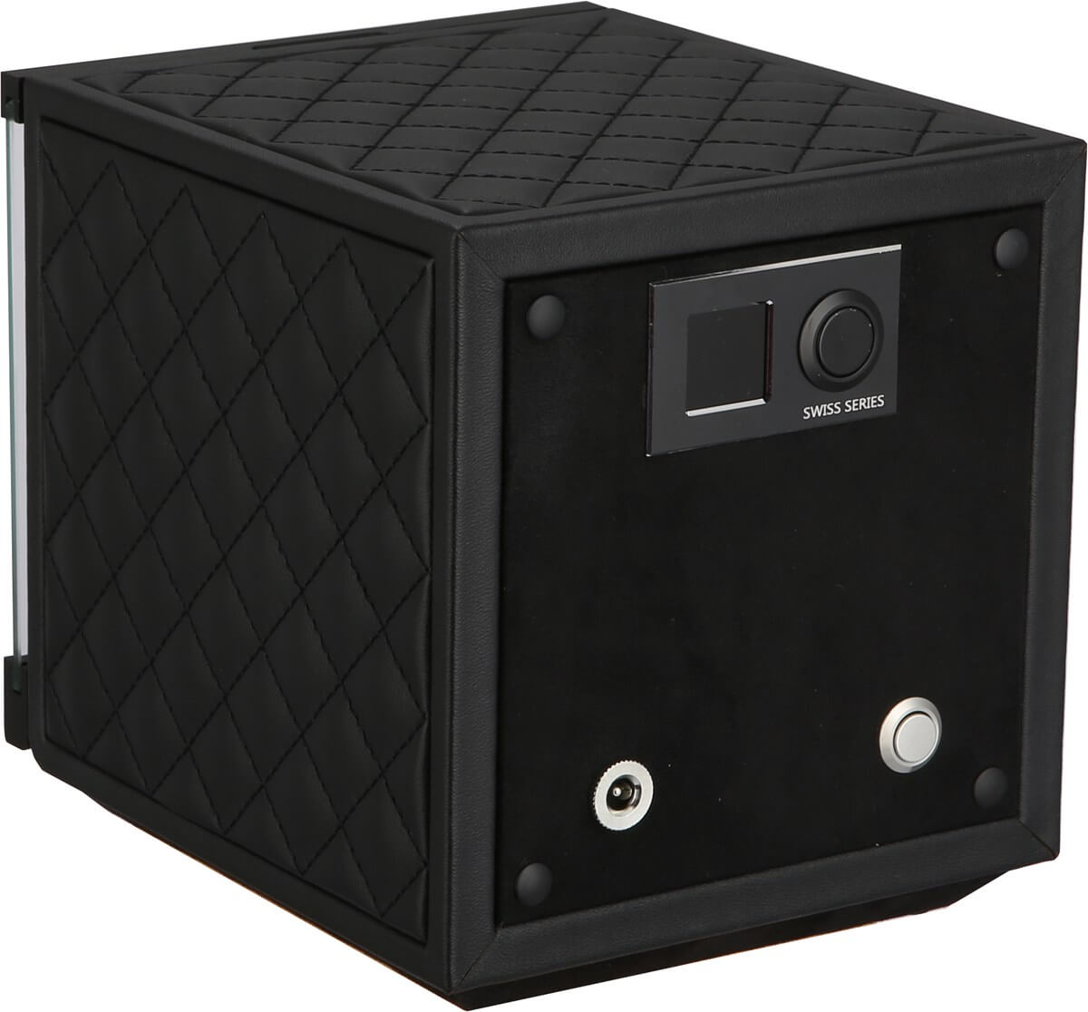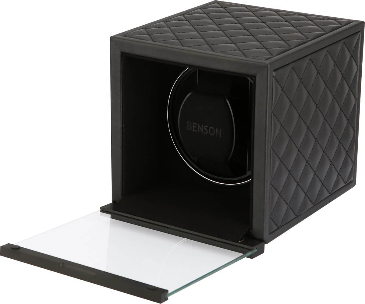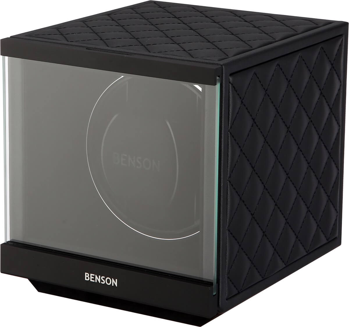 Benson Watch Winder Single Swiss Series 1.20 Black Leather Benson Swiss Series 1.20 Black Leather. The Dutch watch winder brand Benson presents with the Swiss Series a new high-quality collection of watch winders that is equipped with Swiss technology and is fully assembled in the Netherlands. The Swiss made motors have a very low sound level and are among the best on the market. This compact Benson Swiss Series Single 1.20 Black Leather watch winder is suitable for winding any automatic watch because the direction of rotation, the number of revolutions per day and the watch holder can be individually set per watch. The specially developed safety system disengages the motor when a watch is placed in or removed from the watch winder. The watch winder works on mains power but also on batteries. You can select the desired settings in the LCD screen with one button. The combination of Swiss technology, high-quality materials, excellent functionality and assembly in the Netherlands make this Benson Swiss Series Single 1.20 Black Leather watch winder one of the best watch winders in the world.